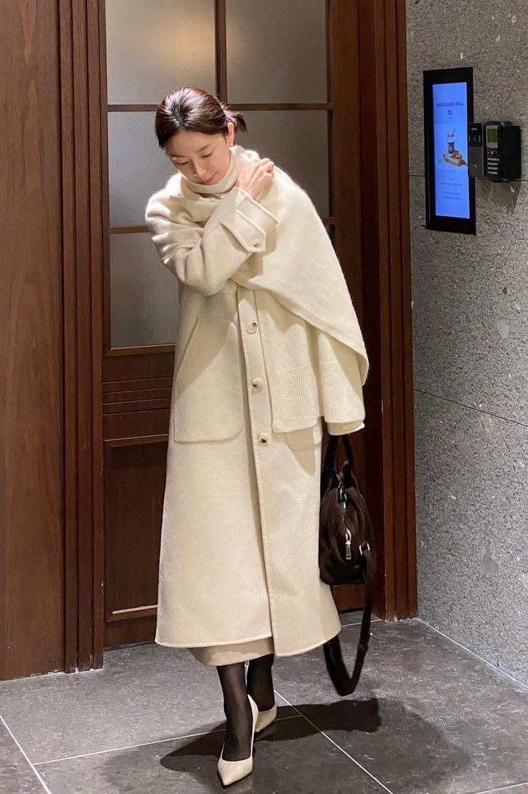Those who favor an elegant, minimalist style can apply the formula of wearing a head-to-toe cream outfit. The attire includes a wool trench coat with a matching scarf, a same-color turtleneck sweater worn underneath, a midi skirt, and high heels. |