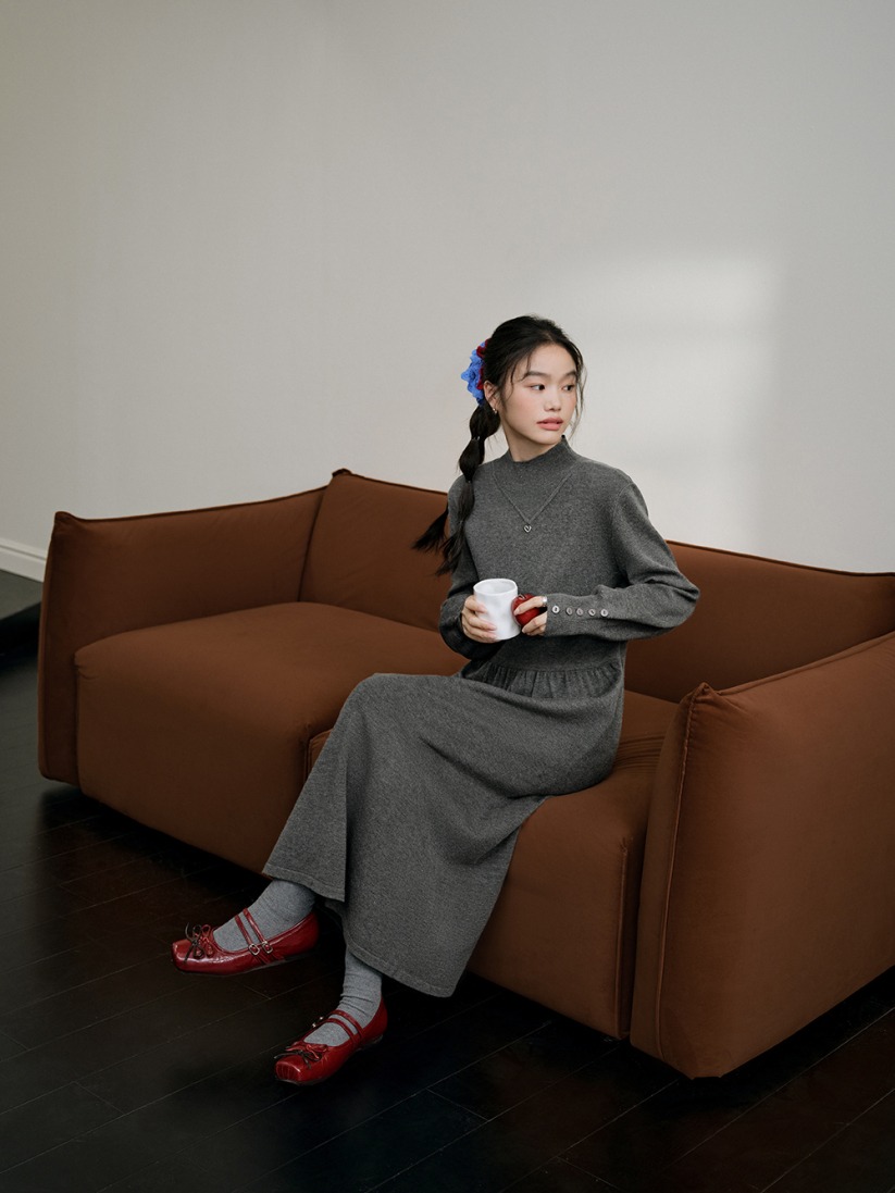 A long-sleeve midi knit dress is one suggestion for busy people. The design is convenient, requiring no thought for coordination. Simply add tights, knee-high boots, or flat shoes for a presentable outfit. |