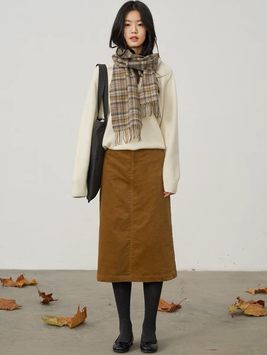 Coordinate outfits in Korean and Japanese office styles, comprising a fitted plain sweater, a calf-length pencil skirt, ballet flats, and a checkered scarf. |