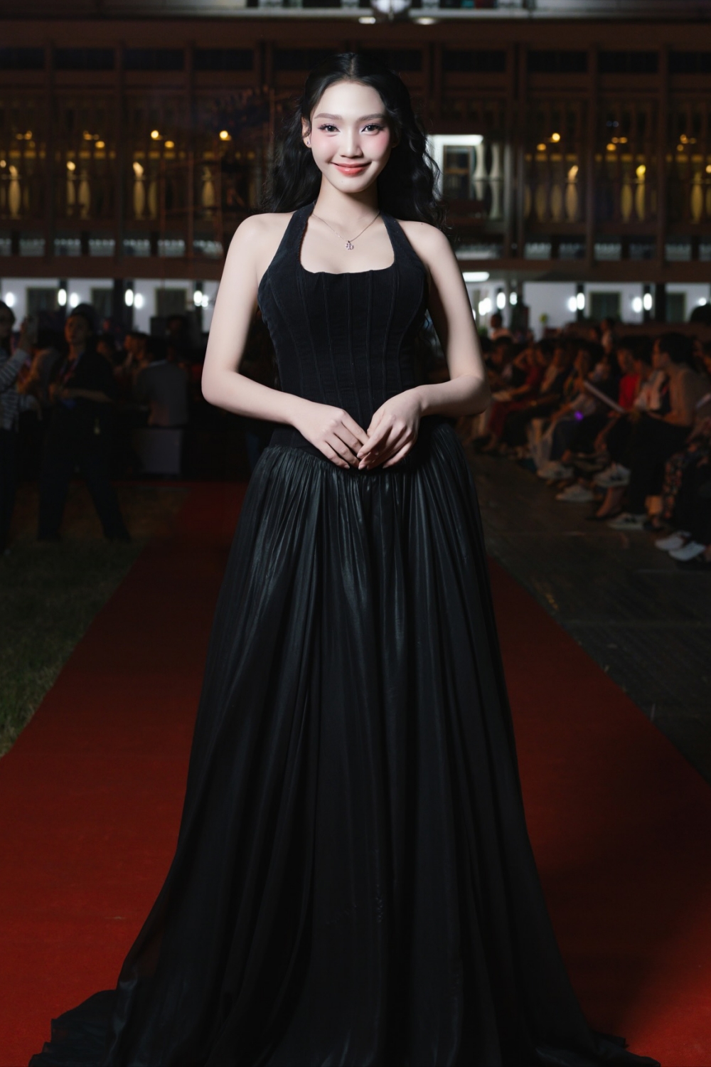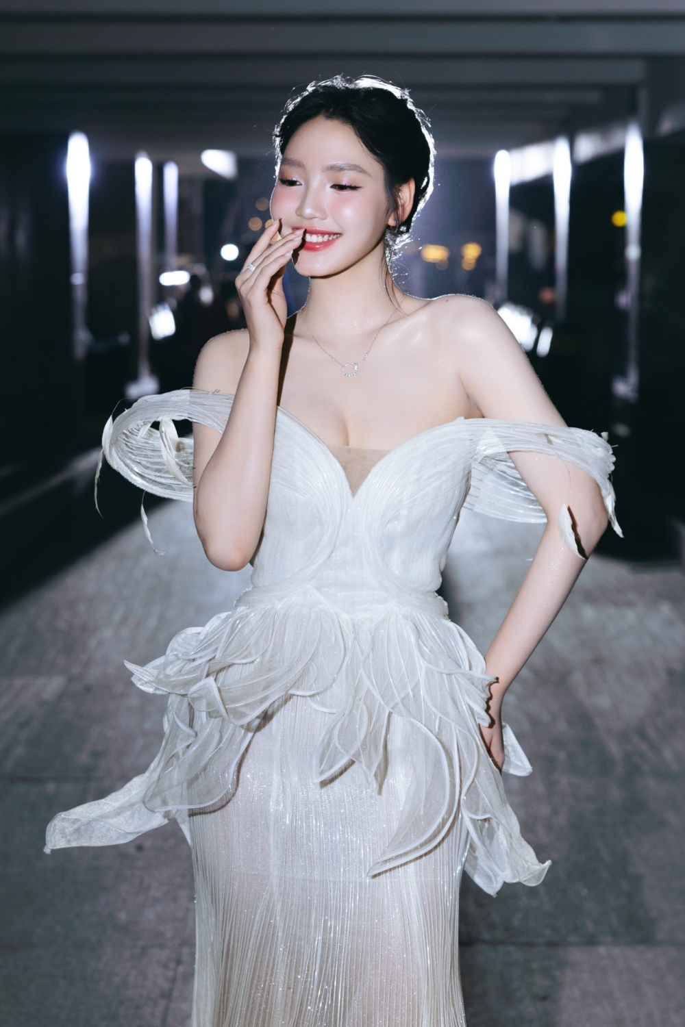 The actress wore a monochrome gown on the red carpet of the Vietnam Film Festival in late 11/2025 in TP HCM. She is currently studying at the Culture Branch of the HCMC Conservatory of Music. During distant filming periods, she transitions to online learning, utilizing her free time on set to keep up with her studies.