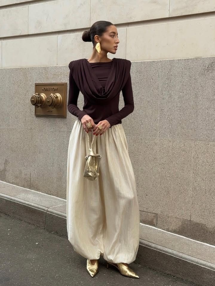 This year, women can experience balloon pants (pants that puff out like a ball). The design offers comfort, suitable for those who prefer a free-spirited, unconventional style and have a moderate height. Depending on the material, you can wear them for daily activities or events.