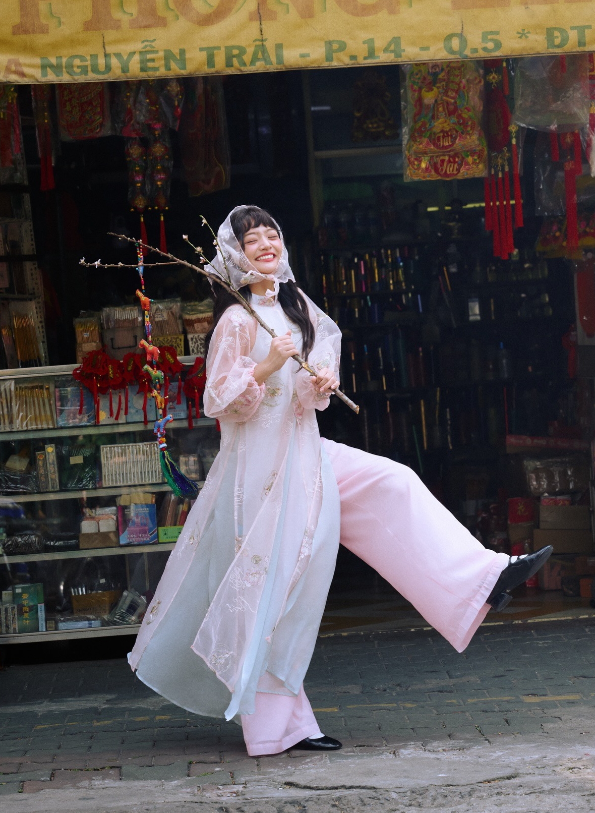 This Tet season, girls also have the option of romantic and classic lace ao dai, paired with ballet flats. Many appreciate this design because it is timeless. *Mare*.