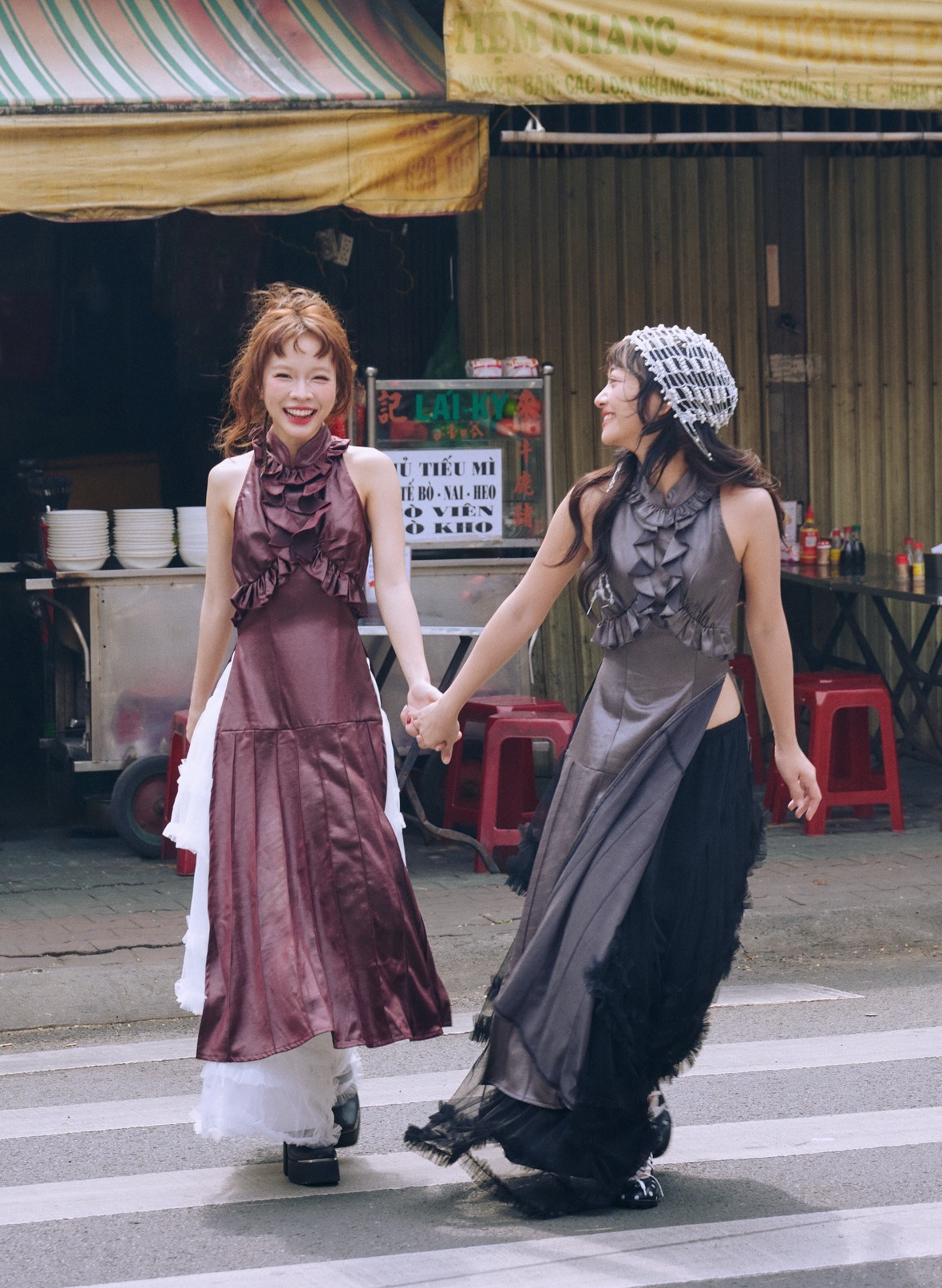 Modernized ao dai with a Y2K aesthetic are also a new highlight in this year's consumer market. The design blends a halter neckline and traditional long flaps with ruffled detailing on the bodice and pleated accents on the lower flaps. This item pairs well with a chiffon skirt or wide-leg jeans, popular choices among Gen Z. *Remmus*.