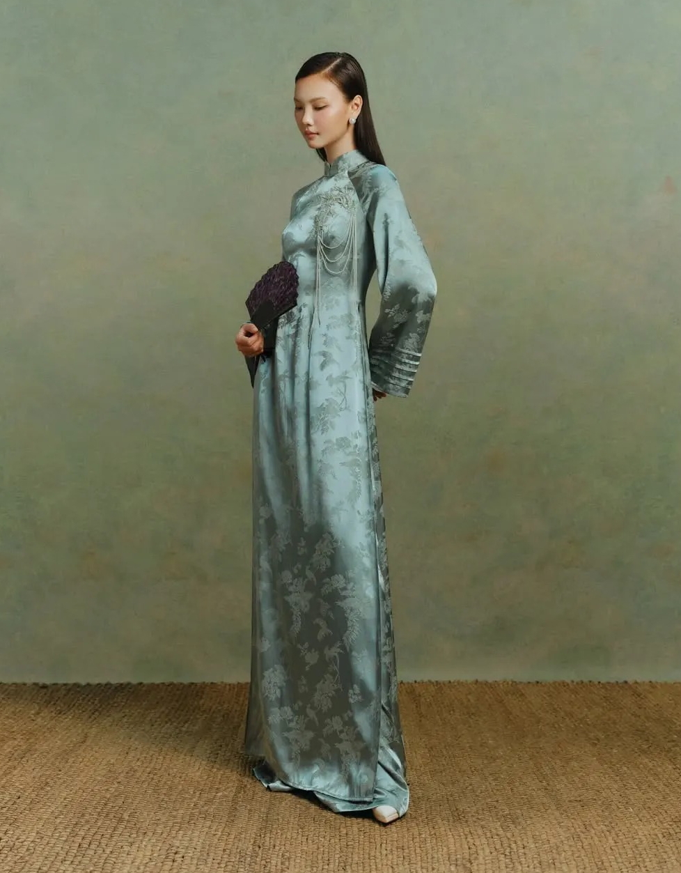The Tet 2026 season sees a surge of ao dai designs in muted tones, playfully dubbed “phu ba” (wealthy lady) ao dai. These designs feature stylized royal patterns, aiming for a dignified and noble appearance.