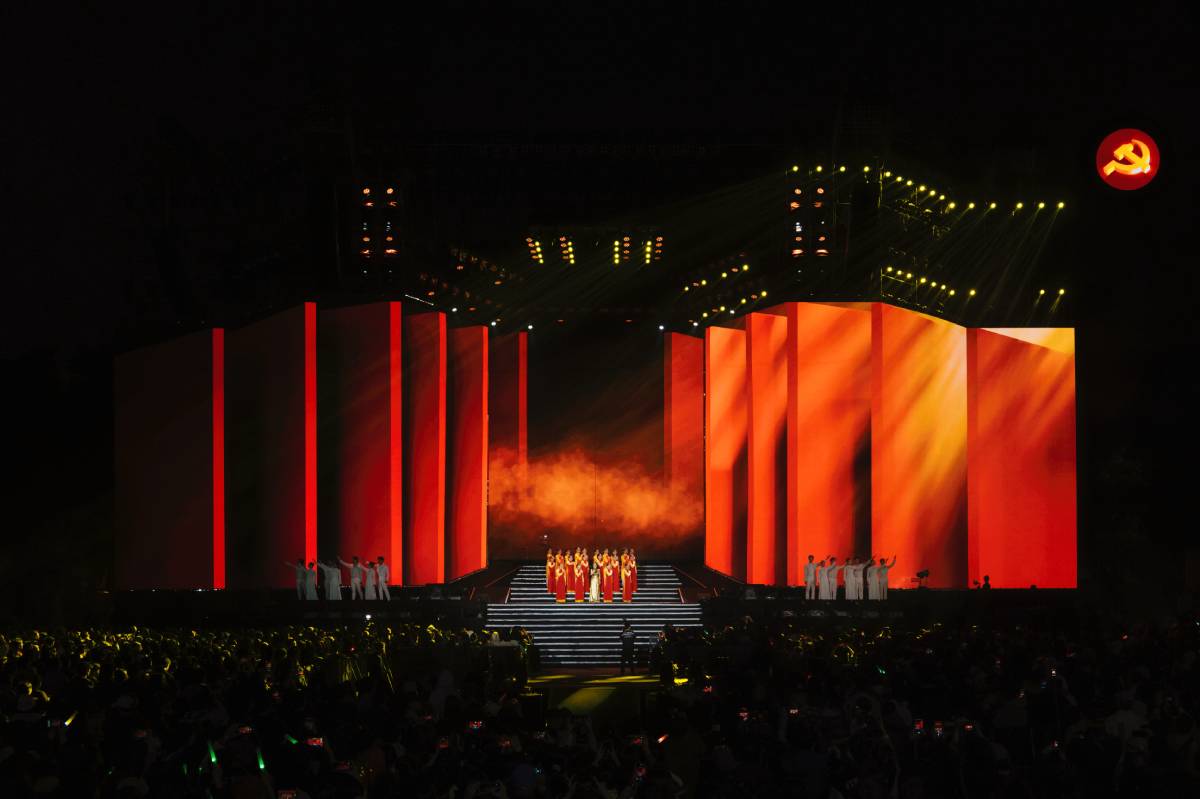 A highlight of the program was the unprecedented use of a 75-ton self-propelled crane directly within the performance space. Above, a programmed LED mesh system was suspended, creating light imagery that spread from the sky across the entire stage below, enhancing visual depth and producing a striking moment.