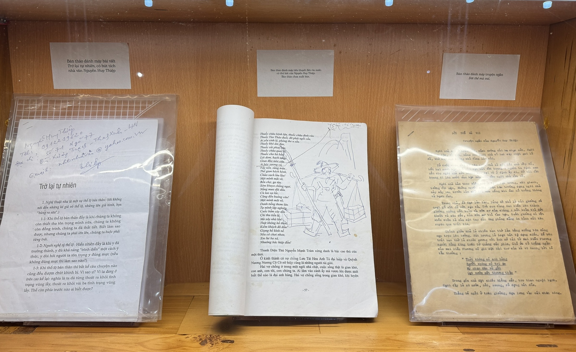 As part of the seminar, Nha Nam and the writer's family organized a small-scale thematic exhibition titled "Manuscripts, Ceramics, and Works of Nguyen Huy Thiep," held from 24/4 to 3/5 at Dong Da Cultural Park, Hanoi. The exhibition features some of the writer's manuscripts, ceramic works, handwritten notes, and a brief history of the domestic and international printing and publishing of his works. This allows visitors to gain insight into his career in literature and painting.