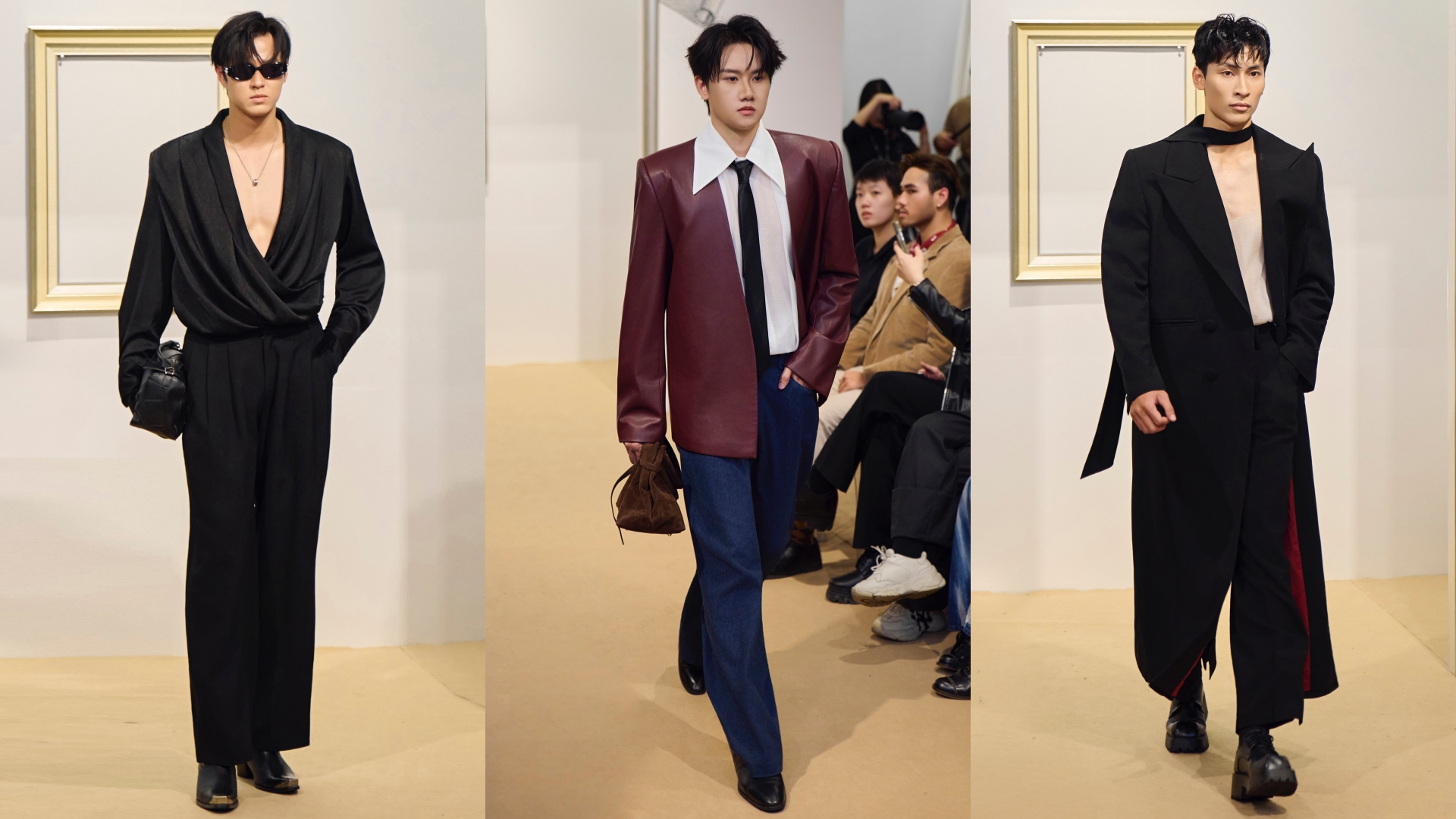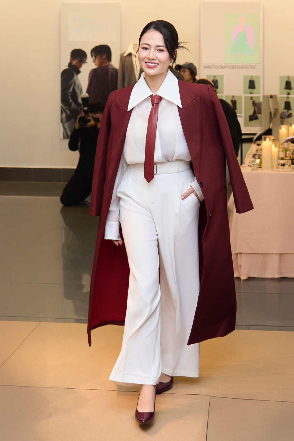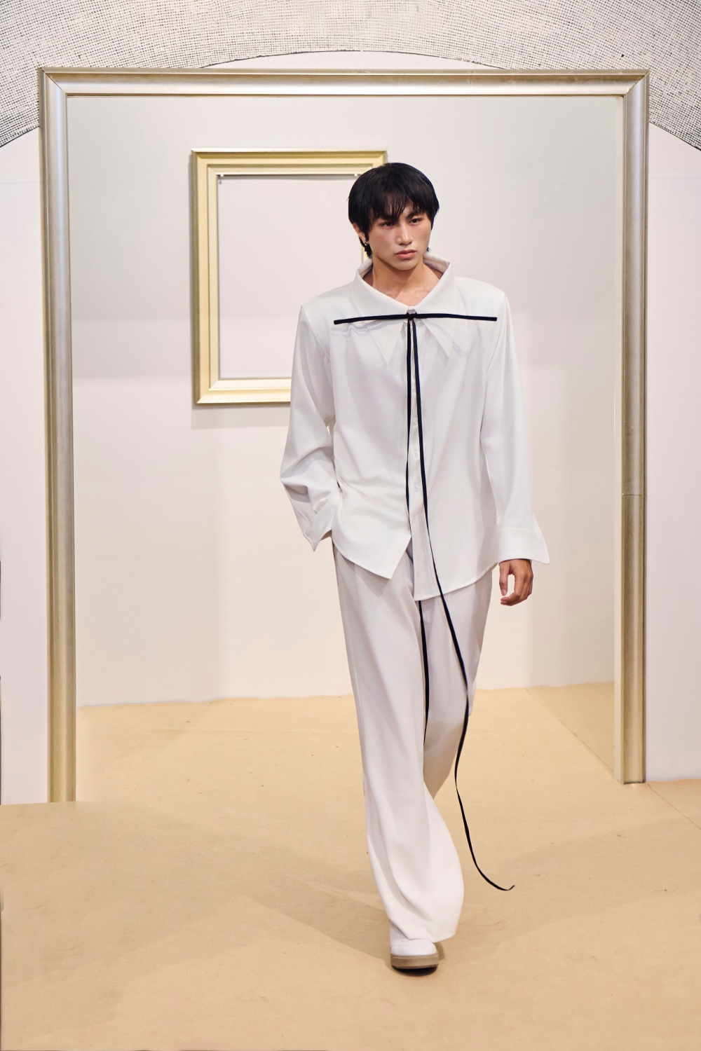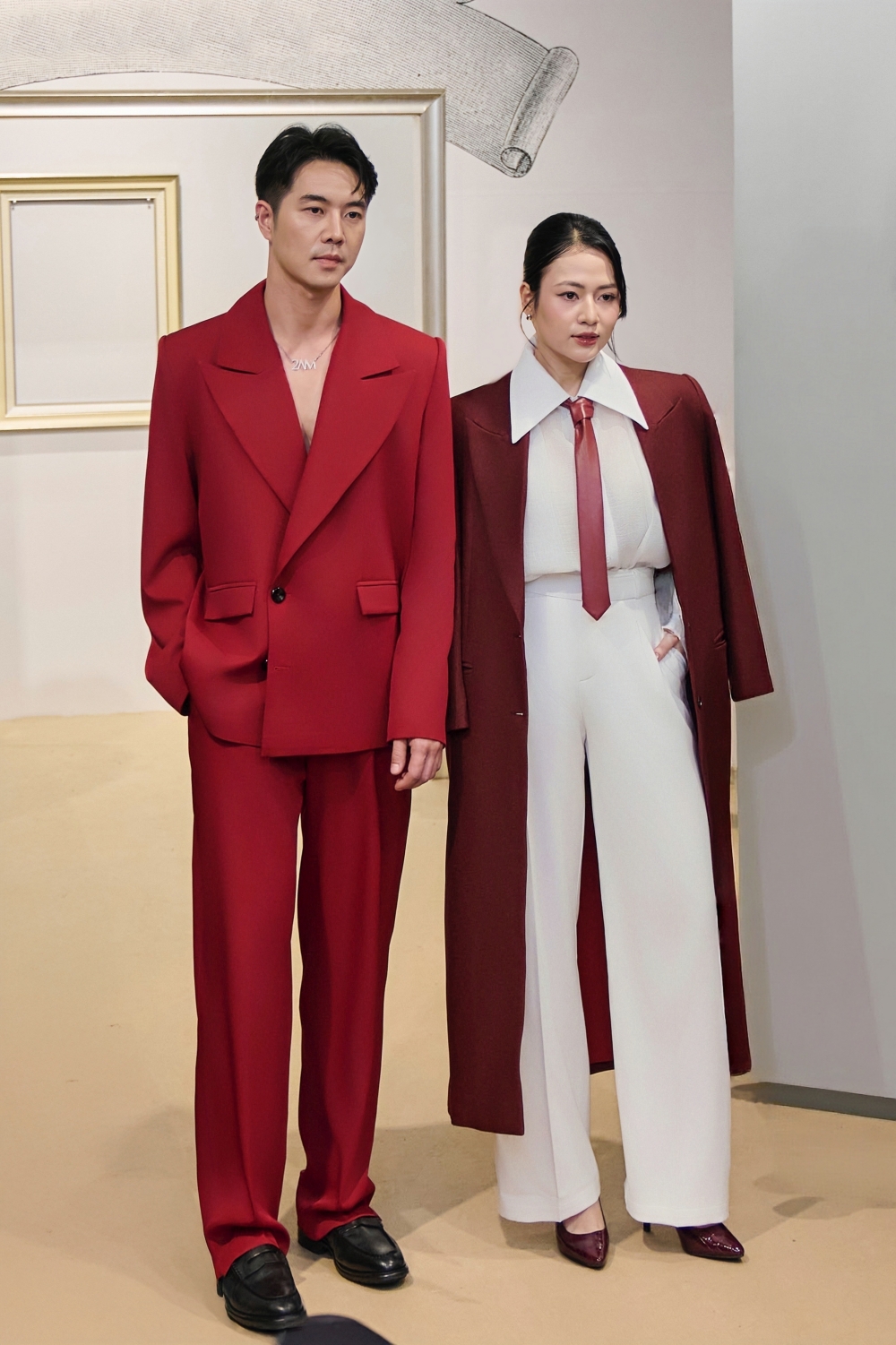 The collection featured silhouettes with sharp, clean cuts, drawing inspiration from architectural lines, picture frames, and museum moldings. The main color palette included white, black, accented with blue and wine red, symbolizing luck and happiness for year-end and new year festivities. |