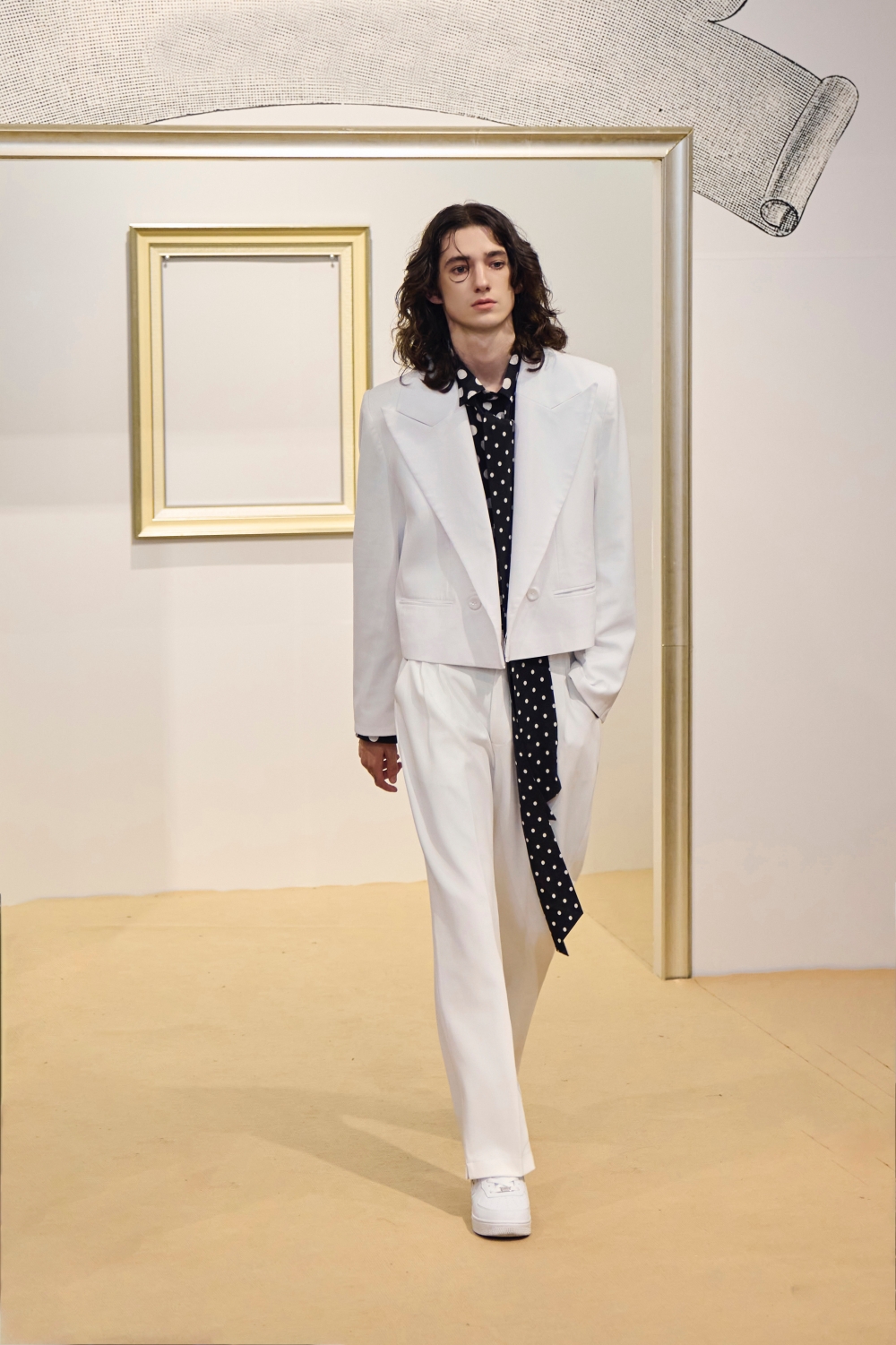 Most designs were unisex, pairing structured jackets with soft silk shirts, bow details, and thin scarves for a feminine touch.