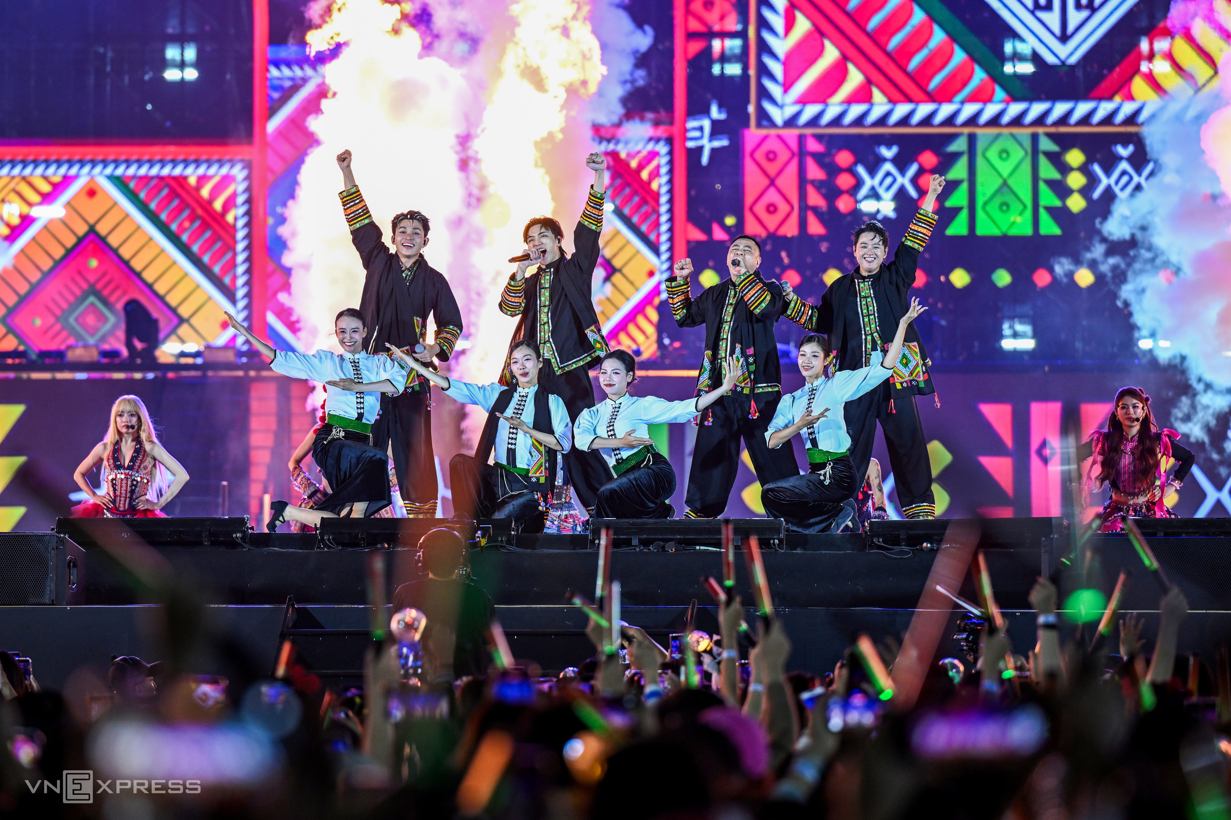 The event stage spanned 240 m2 and was equipped with a modern sound and lighting system. Ten large LED screens ensured easy viewing for the audience in all areas. Many performances were enhanced with fireworks and flares. Despite the large crowd, security, medical services, and check-in procedures were orderly and efficient. Mobile restrooms and numerous food and beverage stalls were also arranged around the stage area.