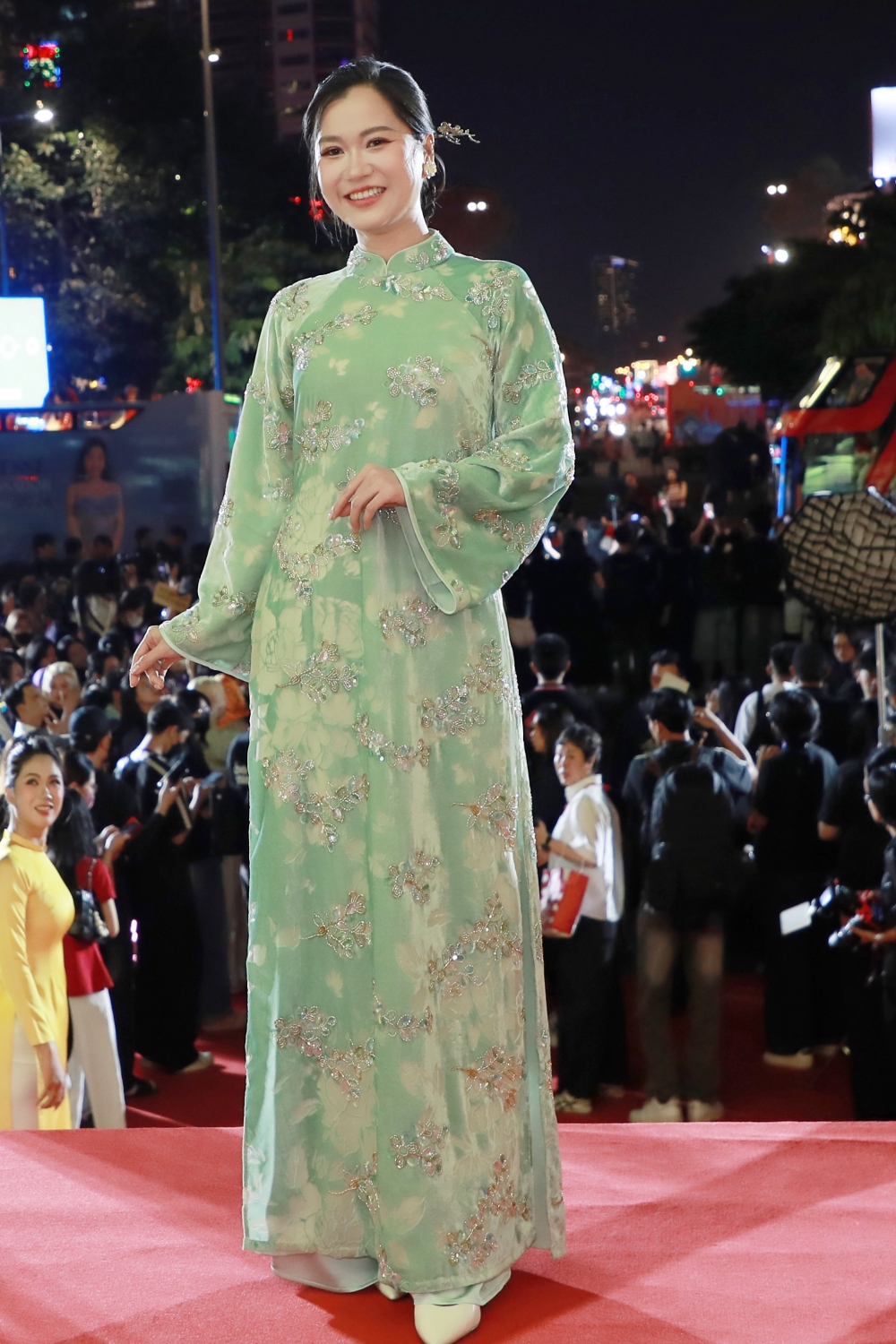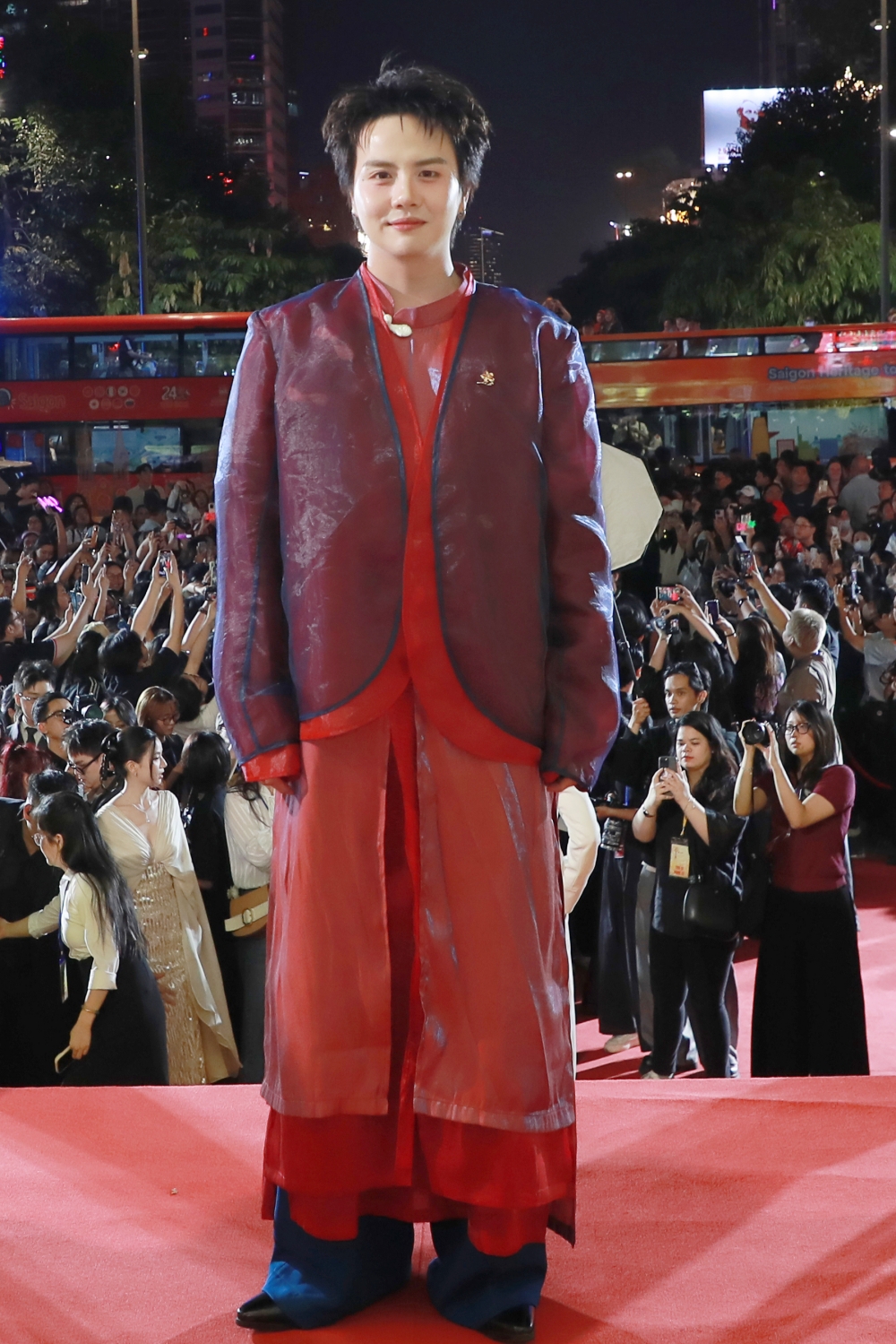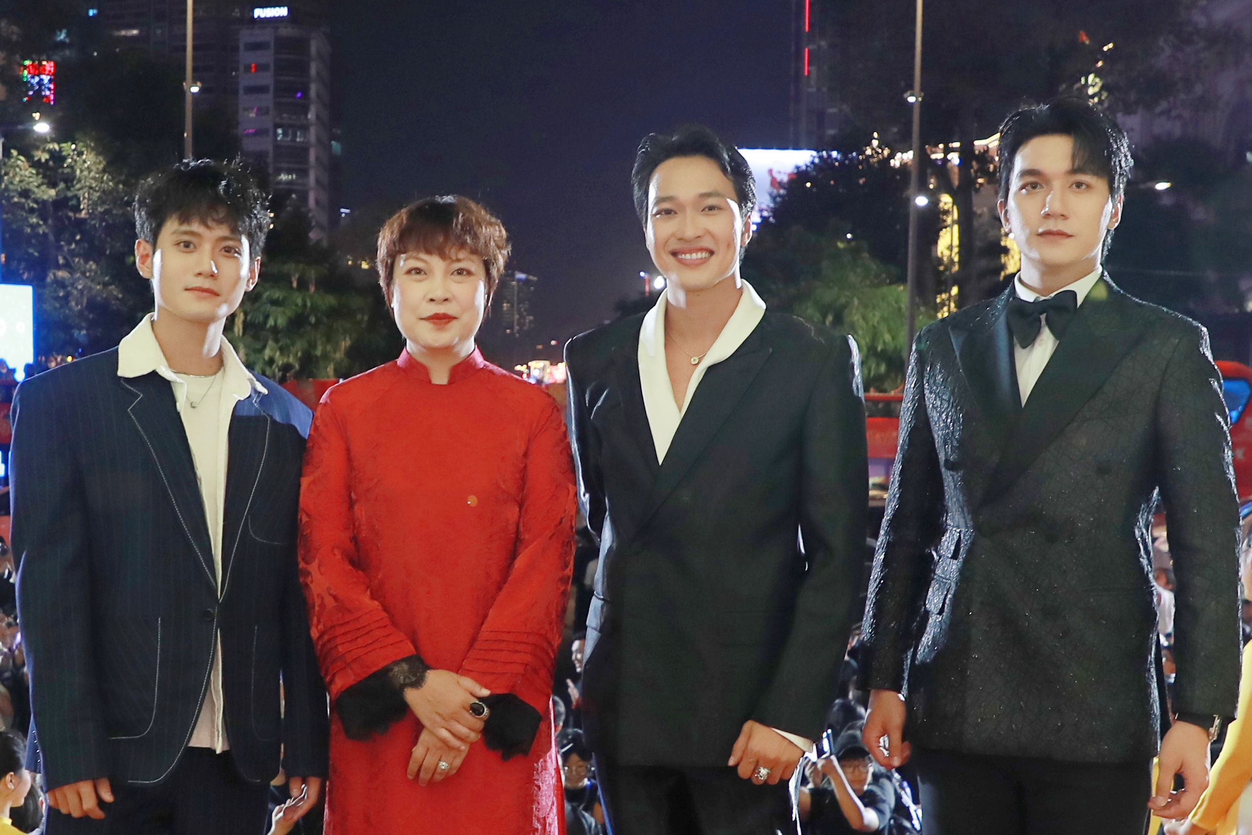 Lien Binh Phat, third from right, joined the stars of "Anh trai vuot ngan chong gai" in wearing monochromatic ao dai. He secured the gold cup for Film - Television Actor for his lead role in the film "Quan Ky Nam". In the film, the actor portrayed Khang, a translator working on a Vietnamese version of Antoine de Saint-Exupery's book "Hoang tu be" (The Little Prince). His character met Ky Nam, an older woman, and a bond gradually formed between them.