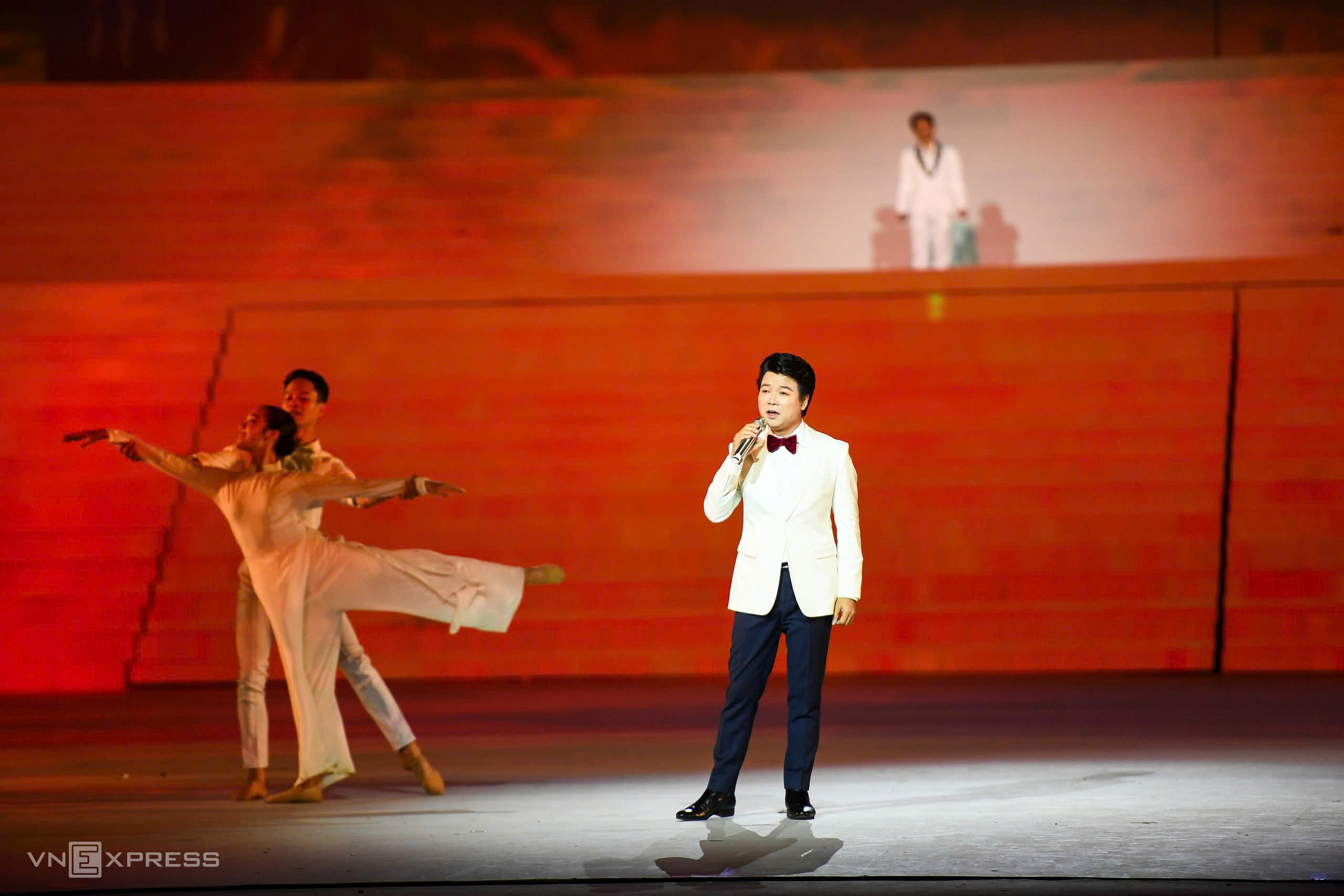 The program featured segments reflecting key historical periods. Singer Dong Hung and a choir performed "Road Ahead" (by musician Tien Minh) and "Uncle Ho is Marching with Us" (by musician Huy Thuc), conveying the optimistic spirit and unwavering faith of the Vietnamese people during wartime. Following this, artist Ta Minh Tam's spirited rendition of "The Nation Full of Joy" (by musician Hoang Ha) emotionally recreated the jubilant atmosphere of national reunification, with flags and flowers everywhere.