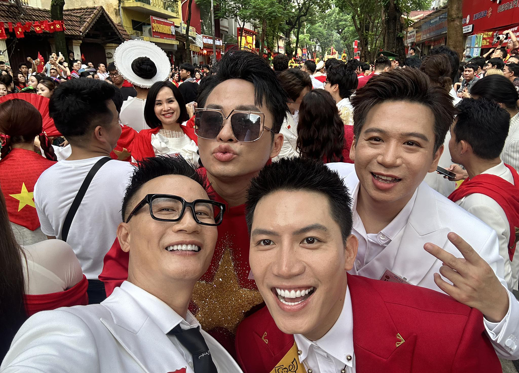 Singers Hoang Bach (left), Tung Duong (back left), Anh Tu, and Hoang Hiep (right) take a commemorative photo before the parade. They also participated in the artistic performance with the song "Viet Nam Oi, Cung Buoc Toi Vinh Quang". |