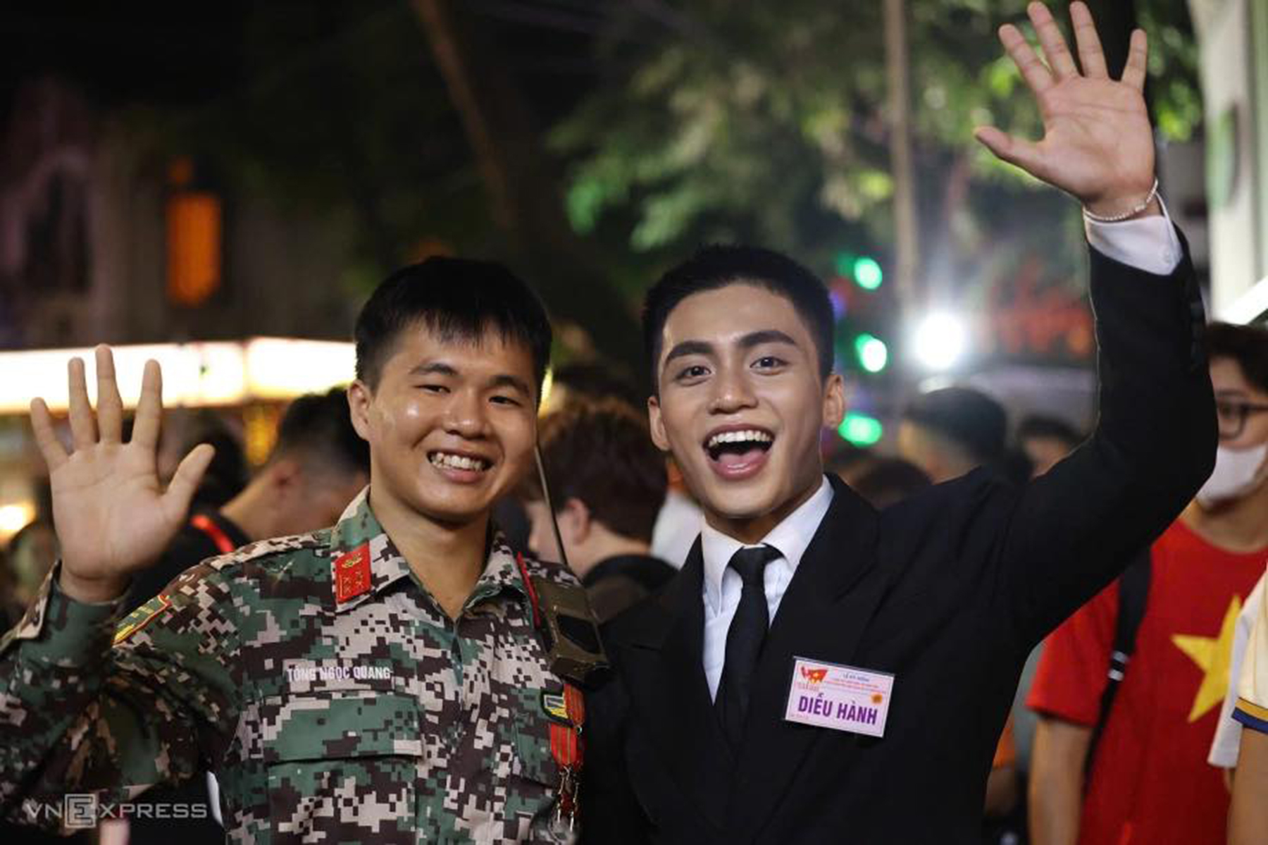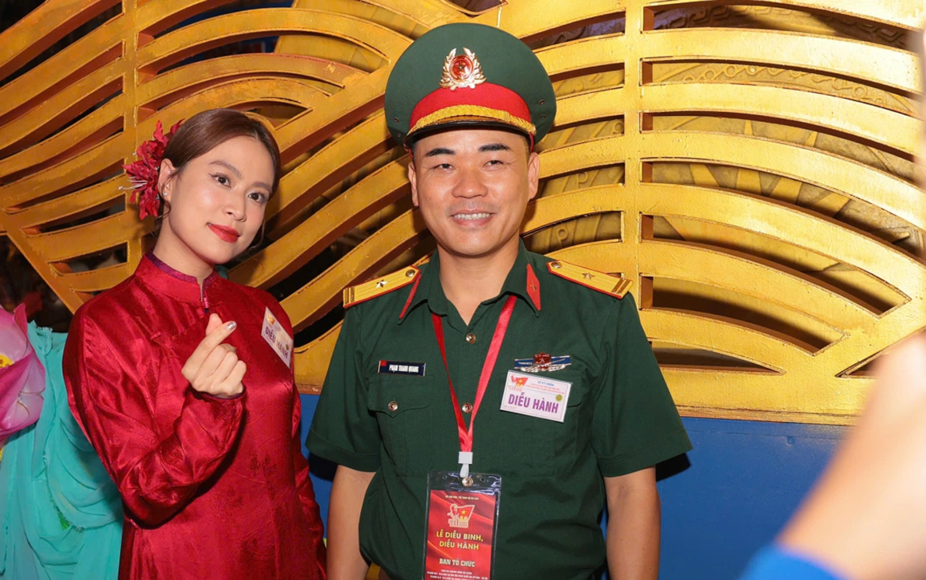 Singer Hoang Thuy Linh interacts with a soldier from the organizing committee of the 80th National Day celebration. |