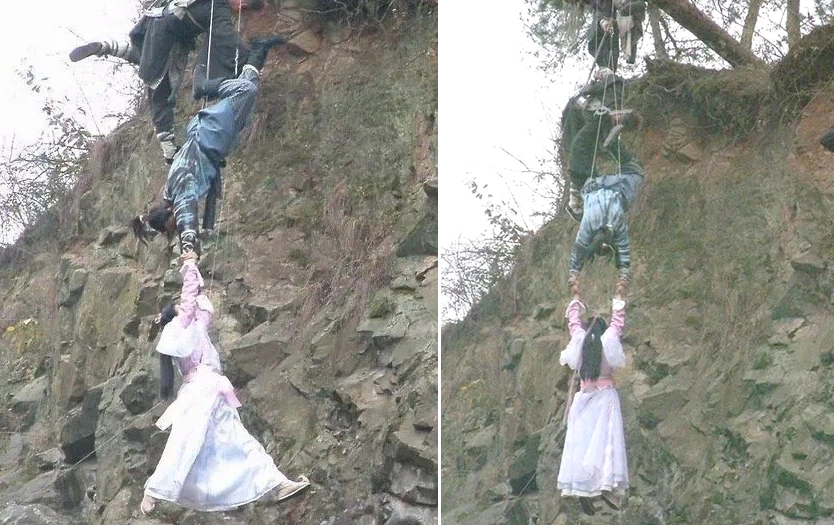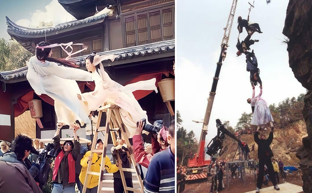 In a cliff-falling scene, Liu Yifei was secured by cables wrapped around her waist and arms. A crew member below supported her legs as she posed as if struggling. Liu Yifei performed most of her own flying and horse-riding scenes.