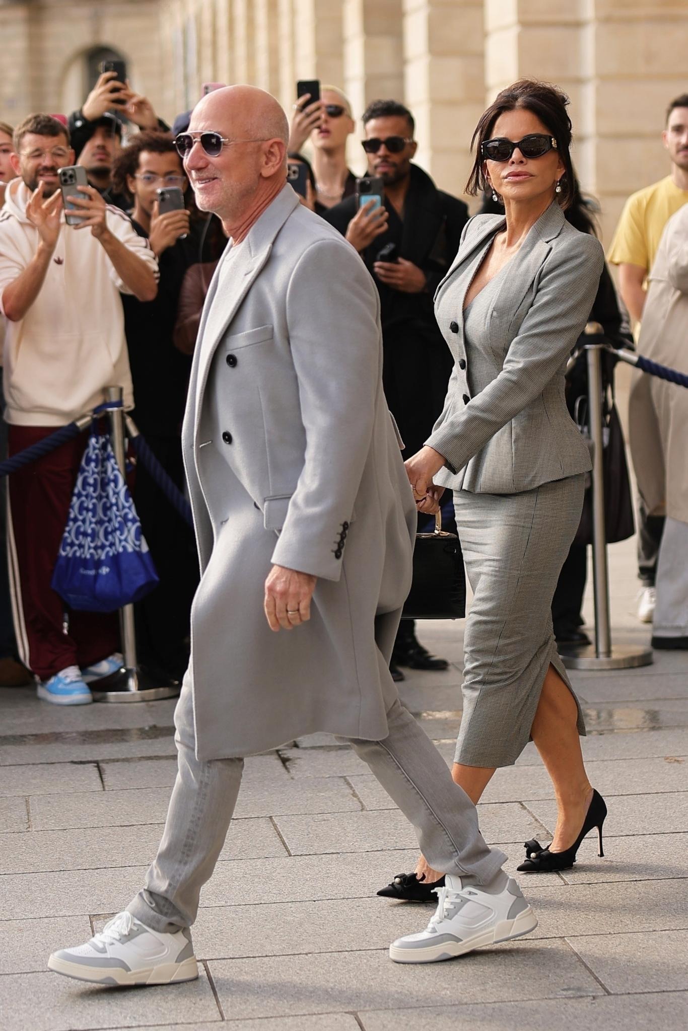 A day earlier, billionaire Jeff Bezos and his wife appeared on the streets of Paris in matching gray outfits. Sanchez wore a peplum top and a vintage John Galliano suit skirt from the Spring-Summer 1995 collection. The Amazon founder coordinated his look with his wife. *Backgrid*