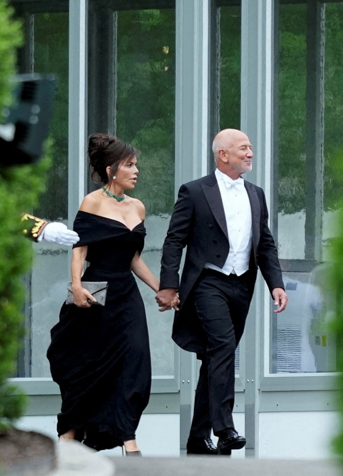 Billionaire Jeff Bezos and his wife, Lauren Sanchez, attended a state dinner at the White House on 28/4, hosted for King Charles III and Queen Camilla. Sanchez garnered attention for her choice of attire, a black off-the-shoulder, deeply low-cut dress. She paired the gown with matching pointed-toe heels, a green necklace, and a silver clutch. The Amazon founder opted for a classic black tuxedo with a white bow tie. The couple was among the early arrivals at the event.