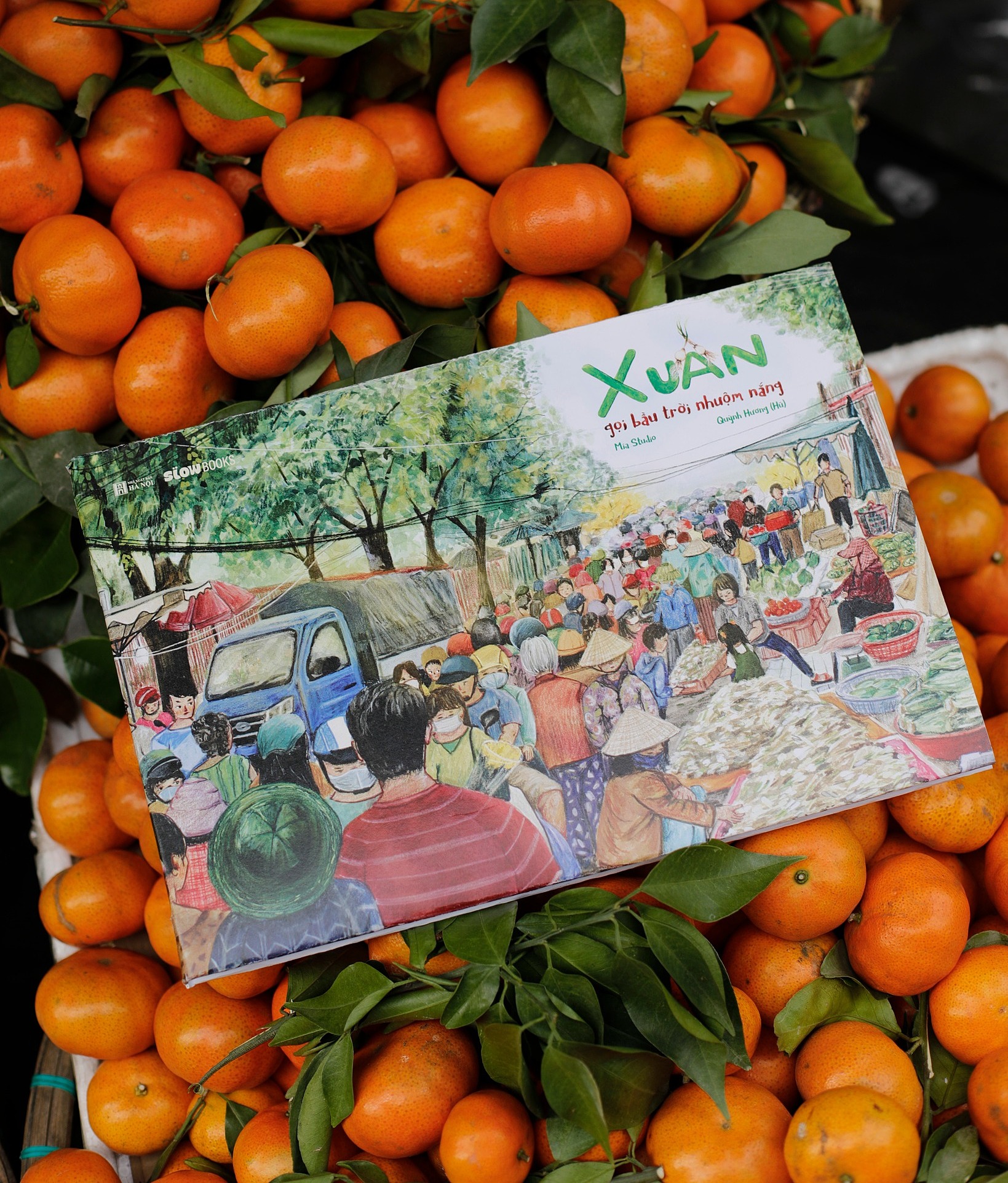 Quynh Huong's "Spring Calls the Sun-Kissed Sky" tells the story of a girl returning home from a garden of aged coriander, carrying a bundle for her mother to prepare for the traditional coriander leaf bath on New Year's Eve. On her way, she meets Little Snail, a young friend who has never understood why Tet requires returning home to family. The girl explains the meaning of Tet, its familiar customs, and the moments of reunion with loved ones during the New Year.