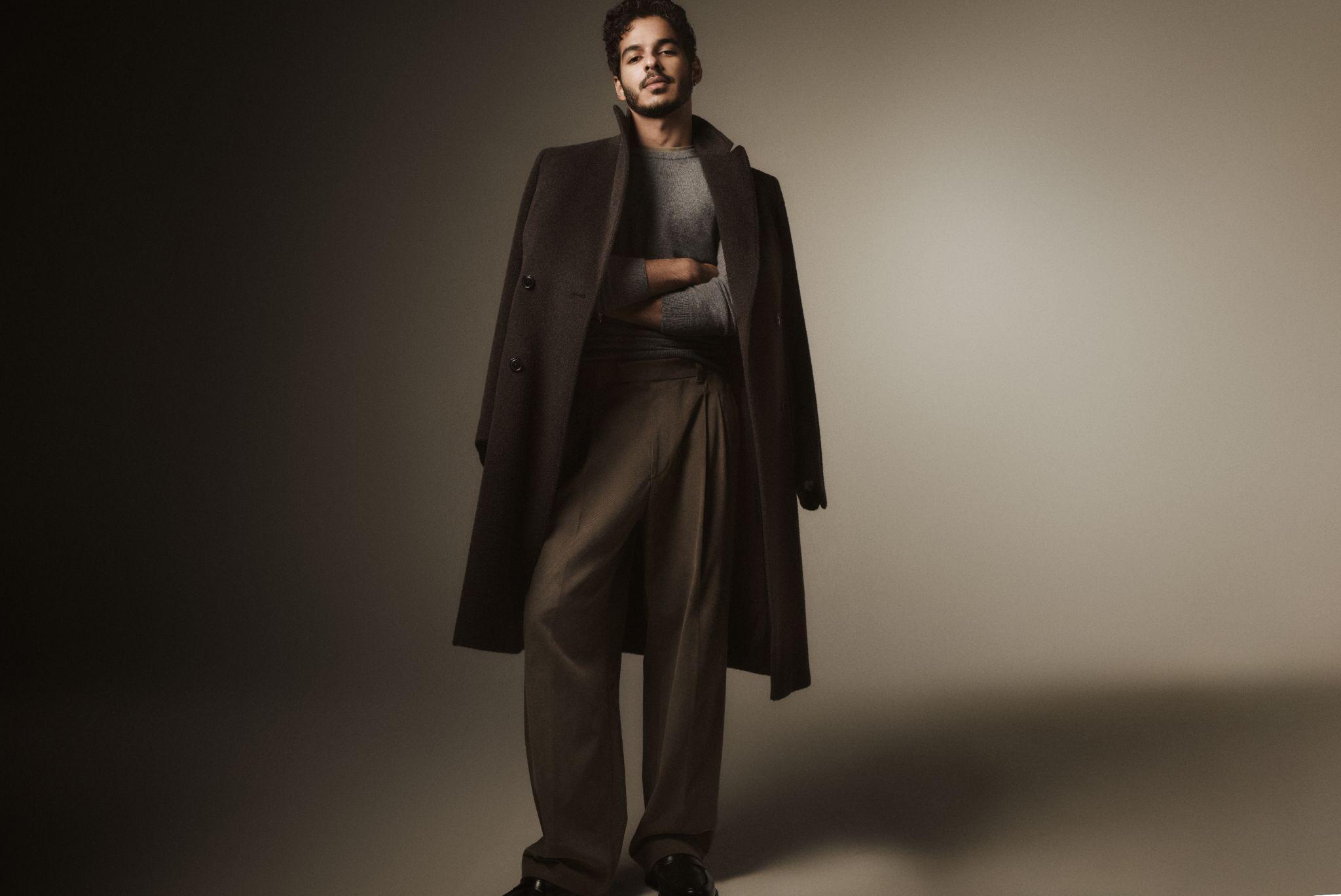 Ishaan Khatter, the Indian actor and dancer who starred in Homebound, appears in one of the season's signature looks. He wears an Italian knit jacket paired with the "New Trouser," a relaxed, double-pleated, straight-leg style making its debut.