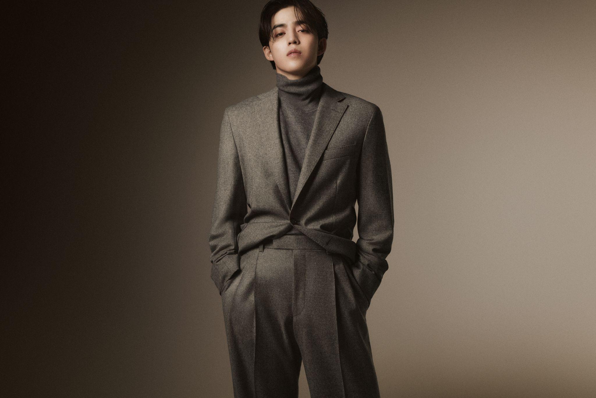 S.Coups, leader of the global K-pop group Seventeen, makes a statement in a silver-gray two-button suit, updated with textured wool and a modern slim fit.