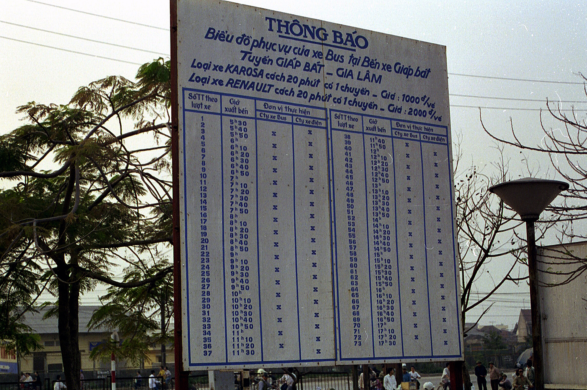 The board at Giap Bat station detailed the departure times for the Giap Bat - Gia Lam route, showing two types of buses with a 1,000 VND fare difference. |