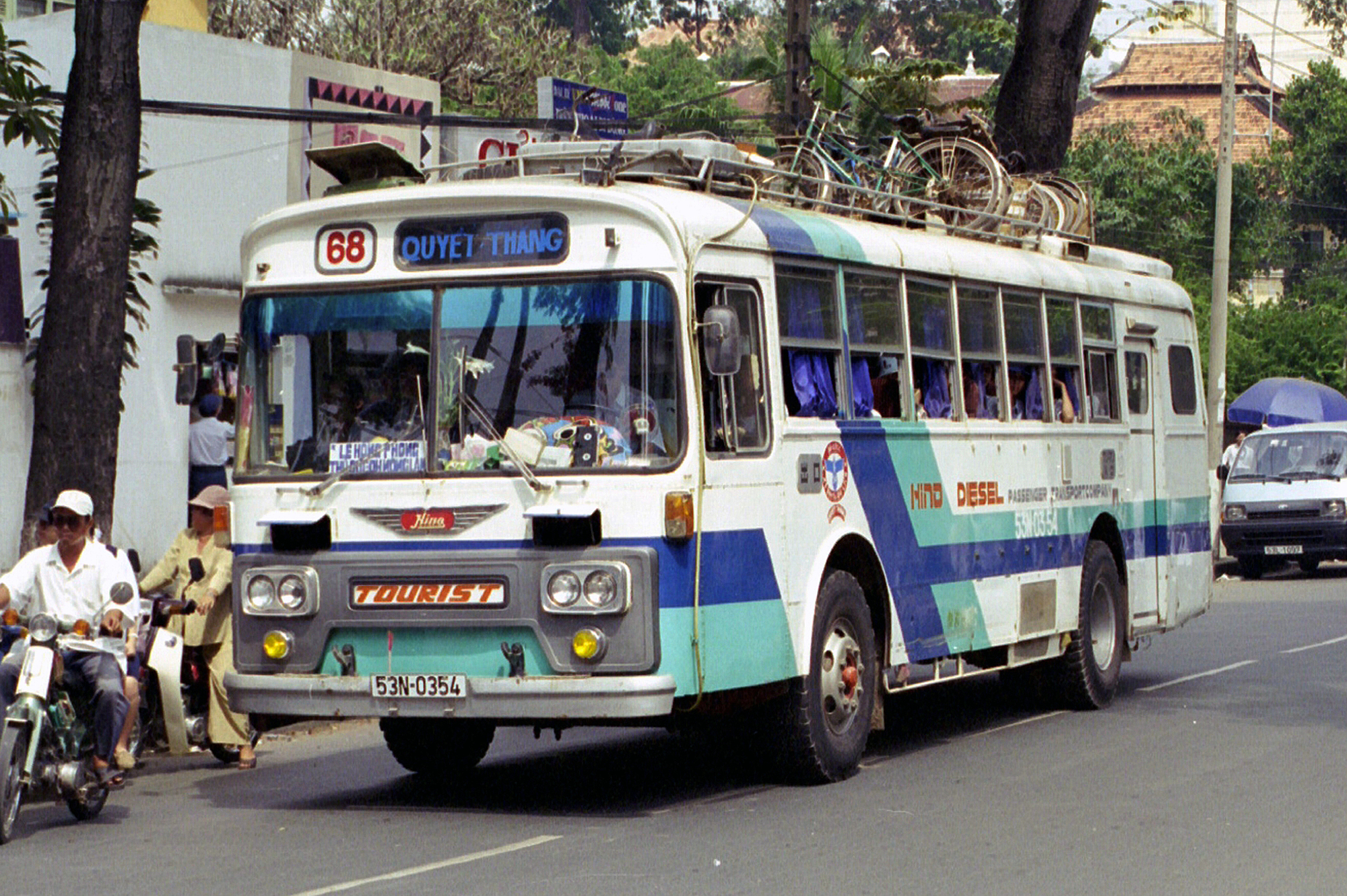 A Quyet Thang bus on a street in Ho Chi Minh City, with passengers' bicycles strapped to its roof. |