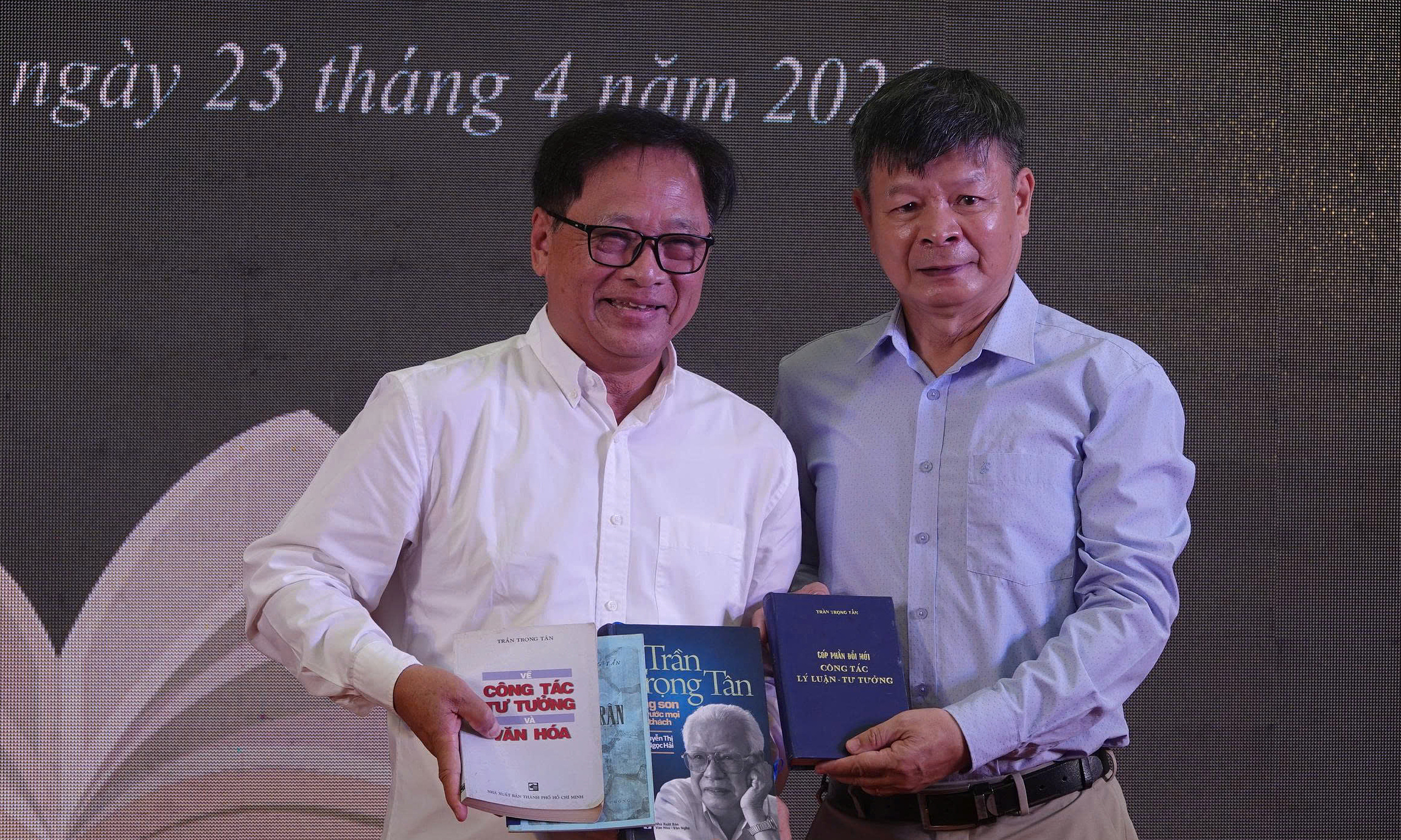 Tran Trong Ninh (right), son of Tran Trong Tan, a former Con Dao political prisoner, presents historical books to Le Hoang, Director of Ho Chi Minh City Book Street and a representative of the program's organizers. Photo: Organizers |