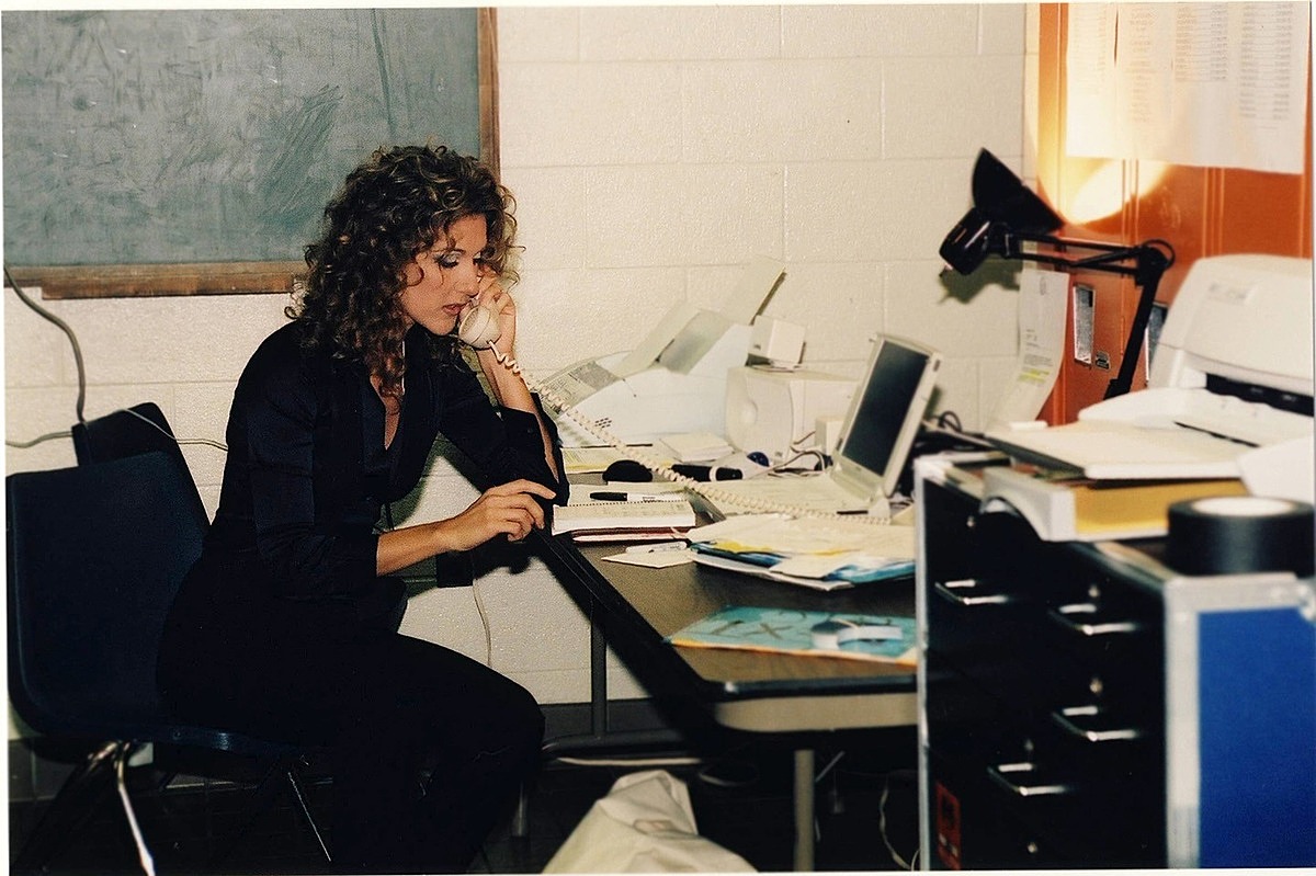 The singer backstage during her Let's Talk About Love World Tour in 1998. A year prior, she achieved widespread acclaim with "My Heart Will Go On", the theme song from the film Titanic. |