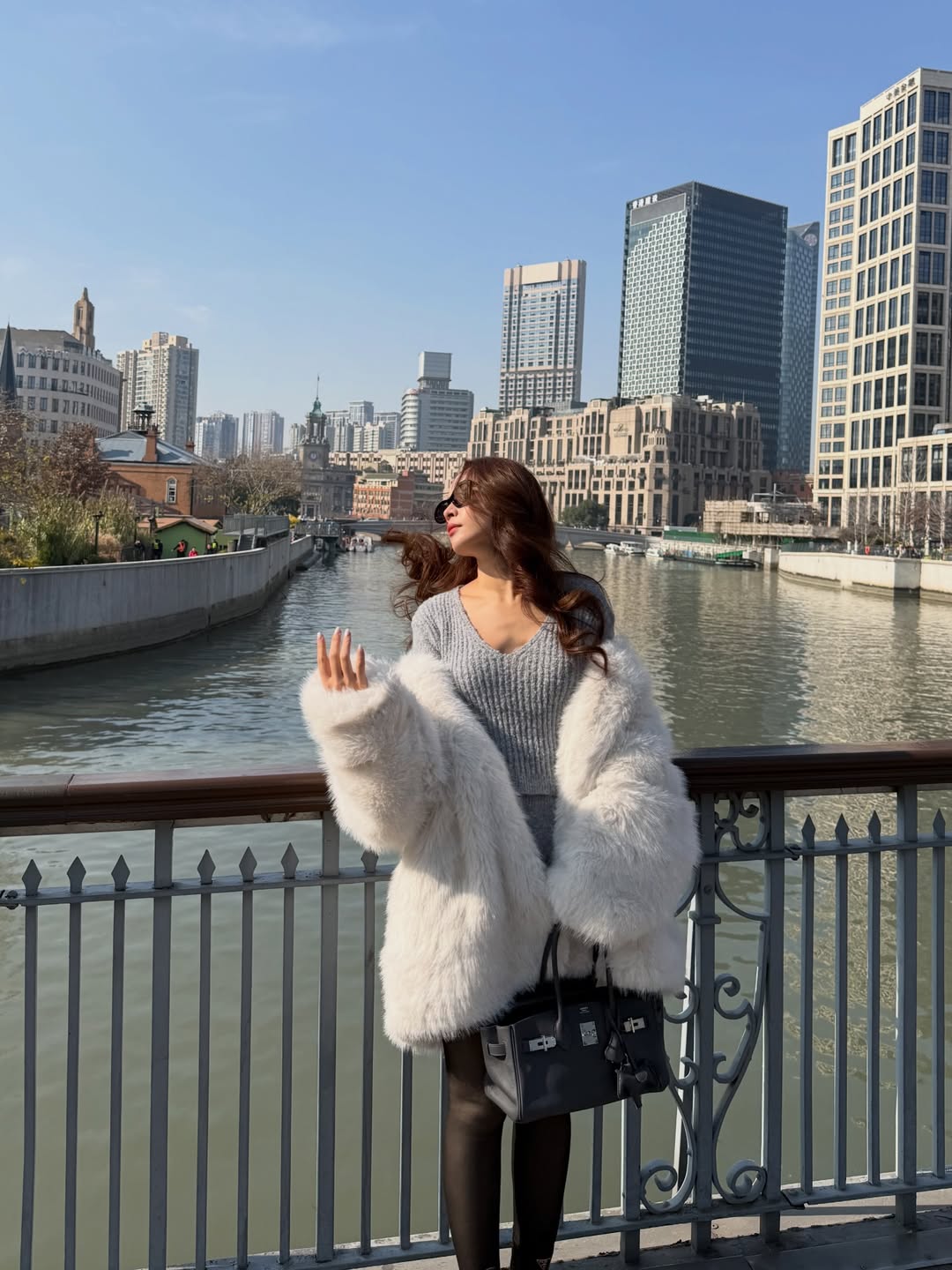 During an early new year trip to Shanghai, Chi Pu layered a white fur coat over a thin knit dress, enhancing her sophisticated look with a Hermes Birkin bag. |