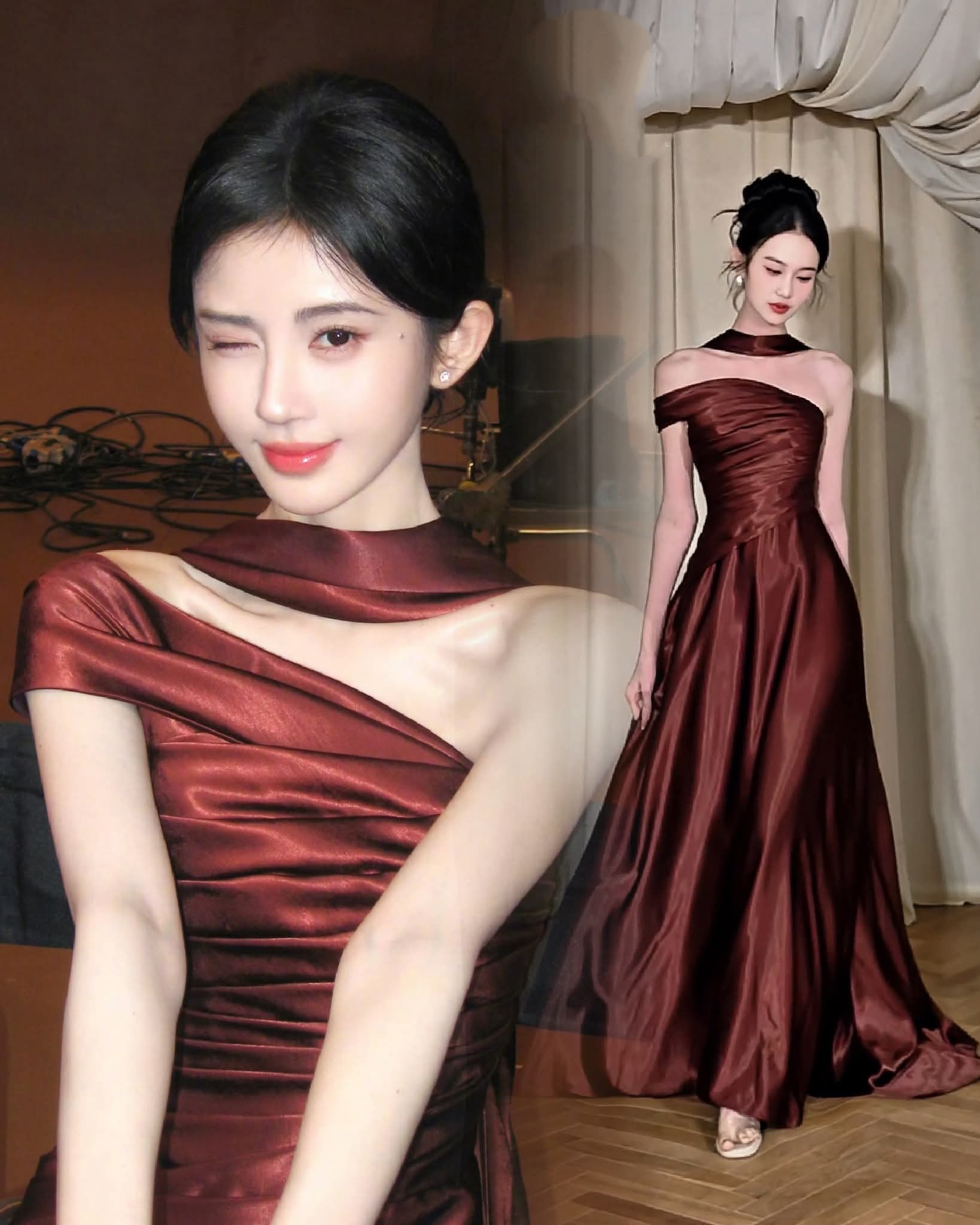In a promotional campaign for a cosmetics brand launched last week, Ju Jingyi impressed in a burgundy asymmetrical silk dress, one of this autumn/winter's hottest colors. The high-end satin design, featuring a strapless bodice and a long silk wrap around the neck creating a choker, accentuated the actress's elegant collarbone. She paired the dress with a neat bun, gold earrings, and minimal makeup.