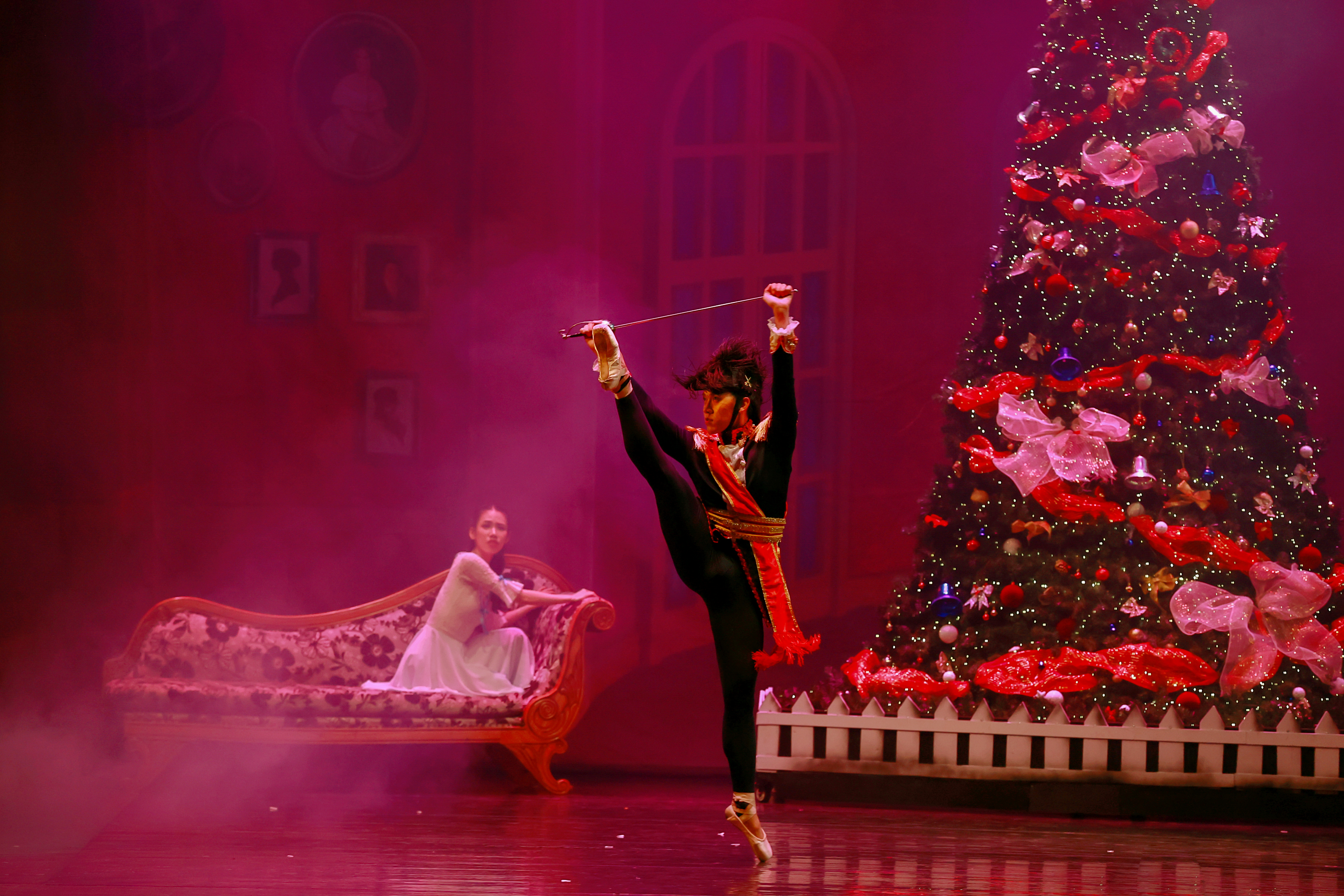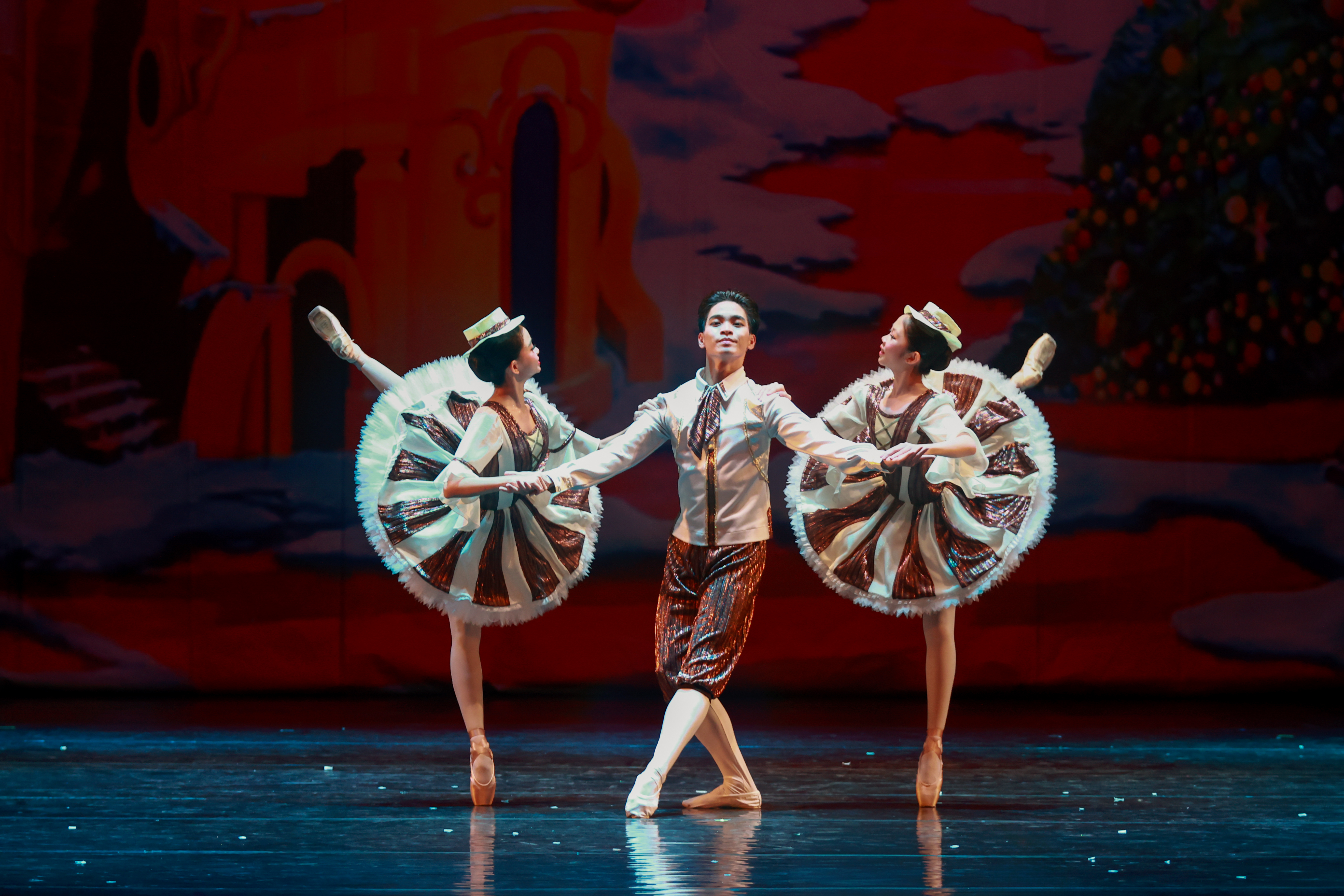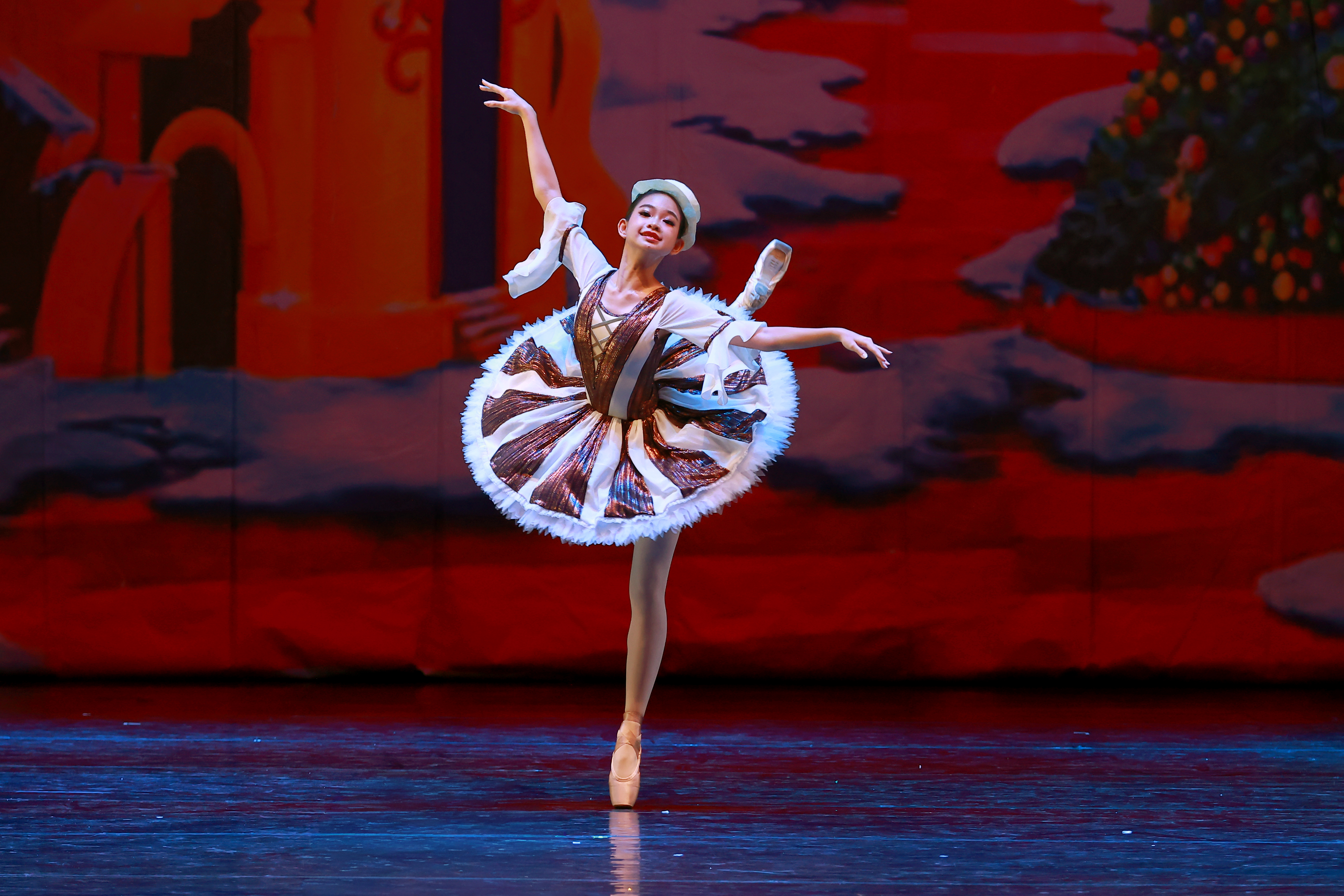 In the Land of Sweets segment, a dancer performs an arabesque with stable balance on pointe. The red stage lighting and Christmas backdrop create an ambiance fitting the ballet's festive mood.