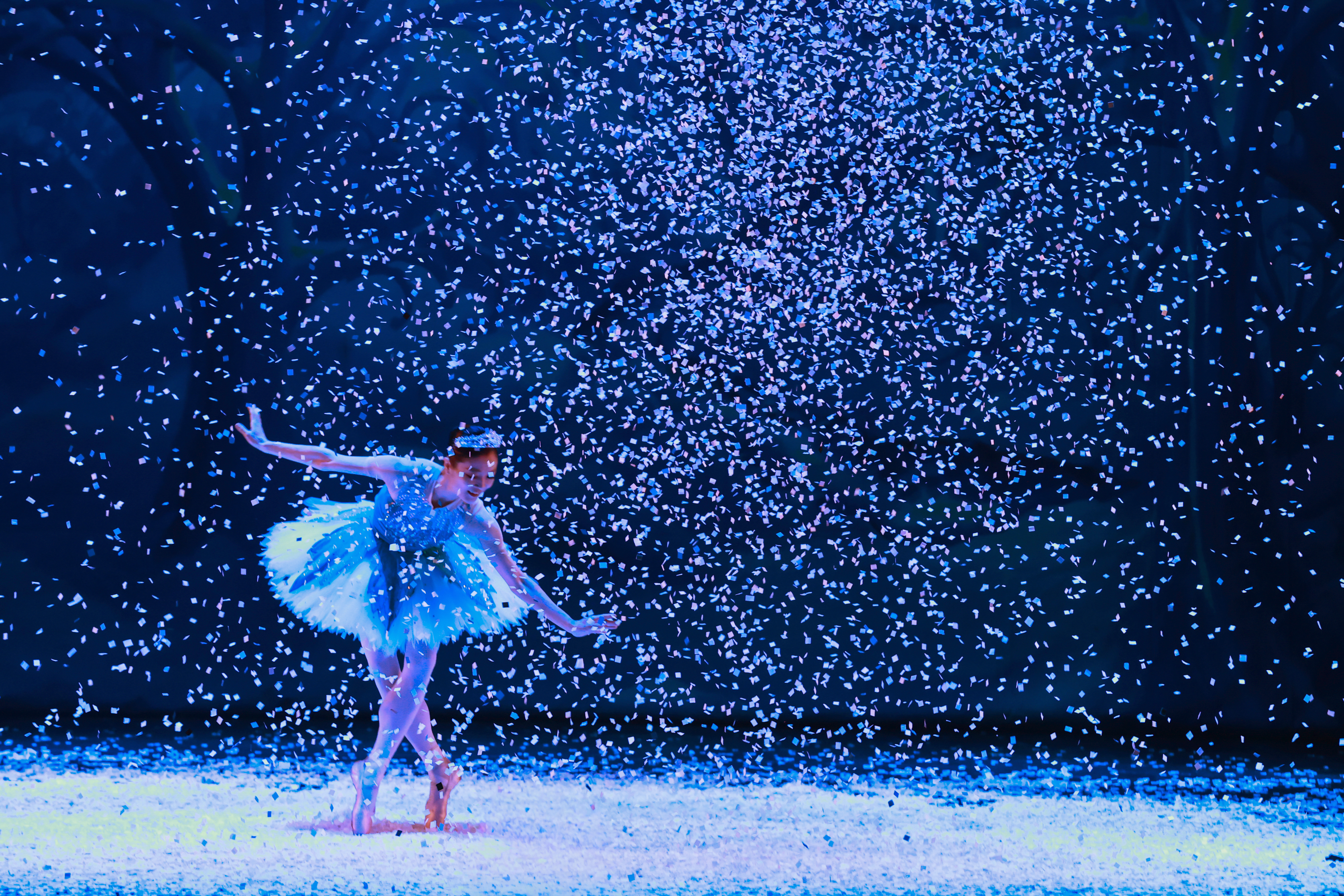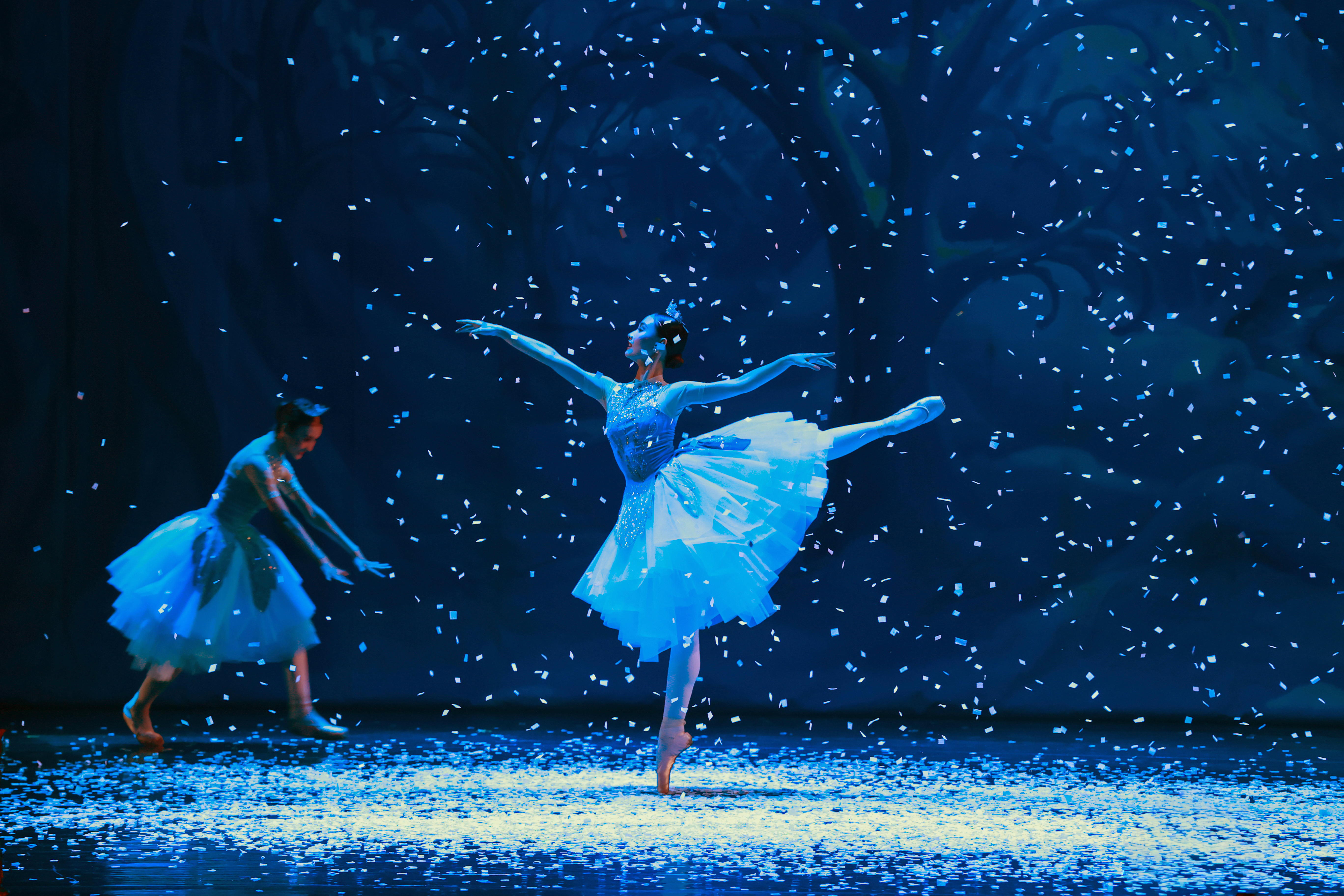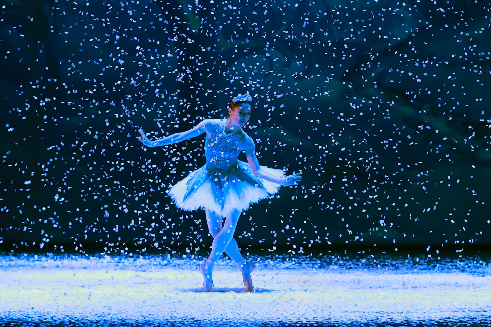Bathed in blue light, a dancer executes an arabesque. Stage effects accentuate the movement, symbolizing the winter atmosphere within "The Nutcracker".