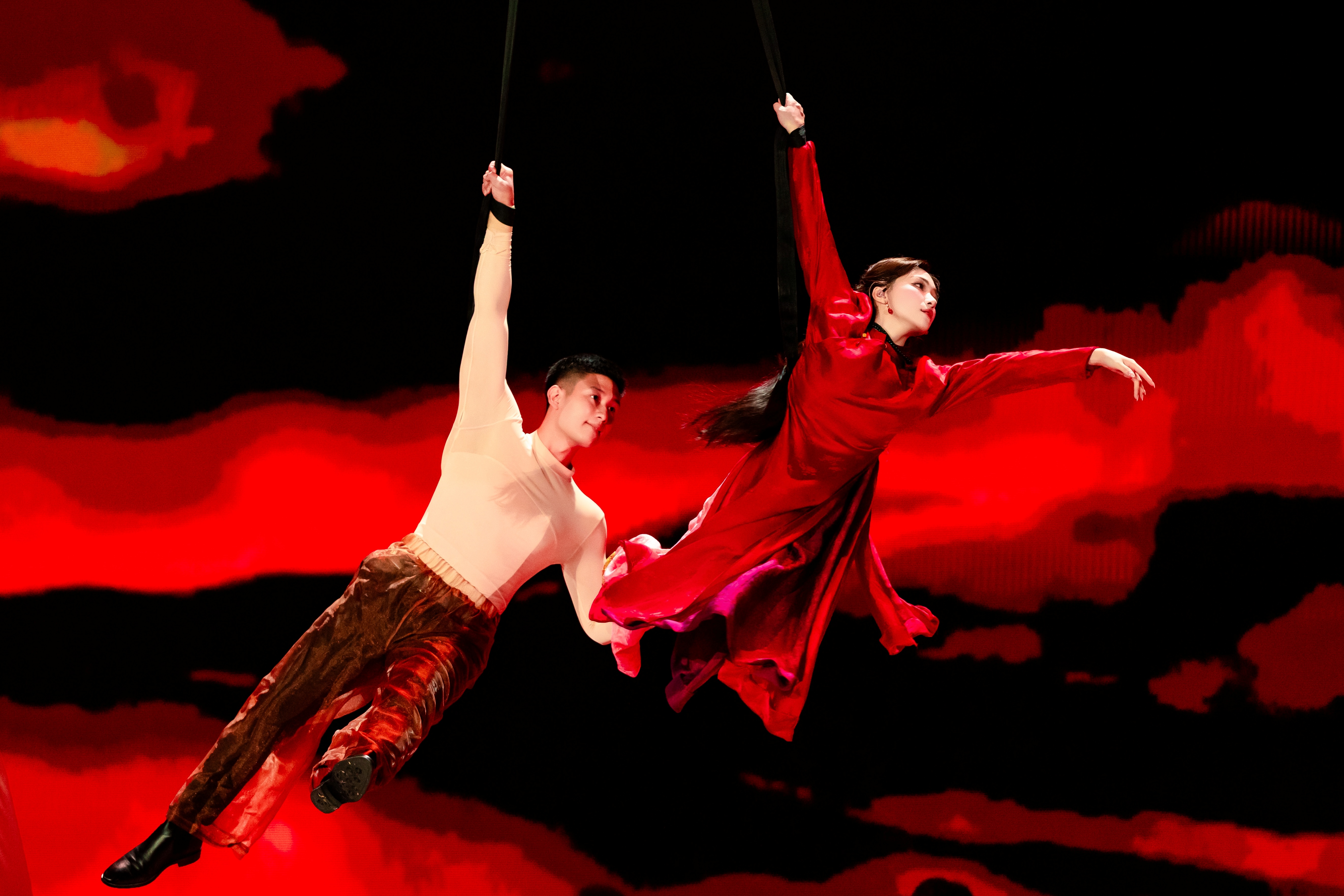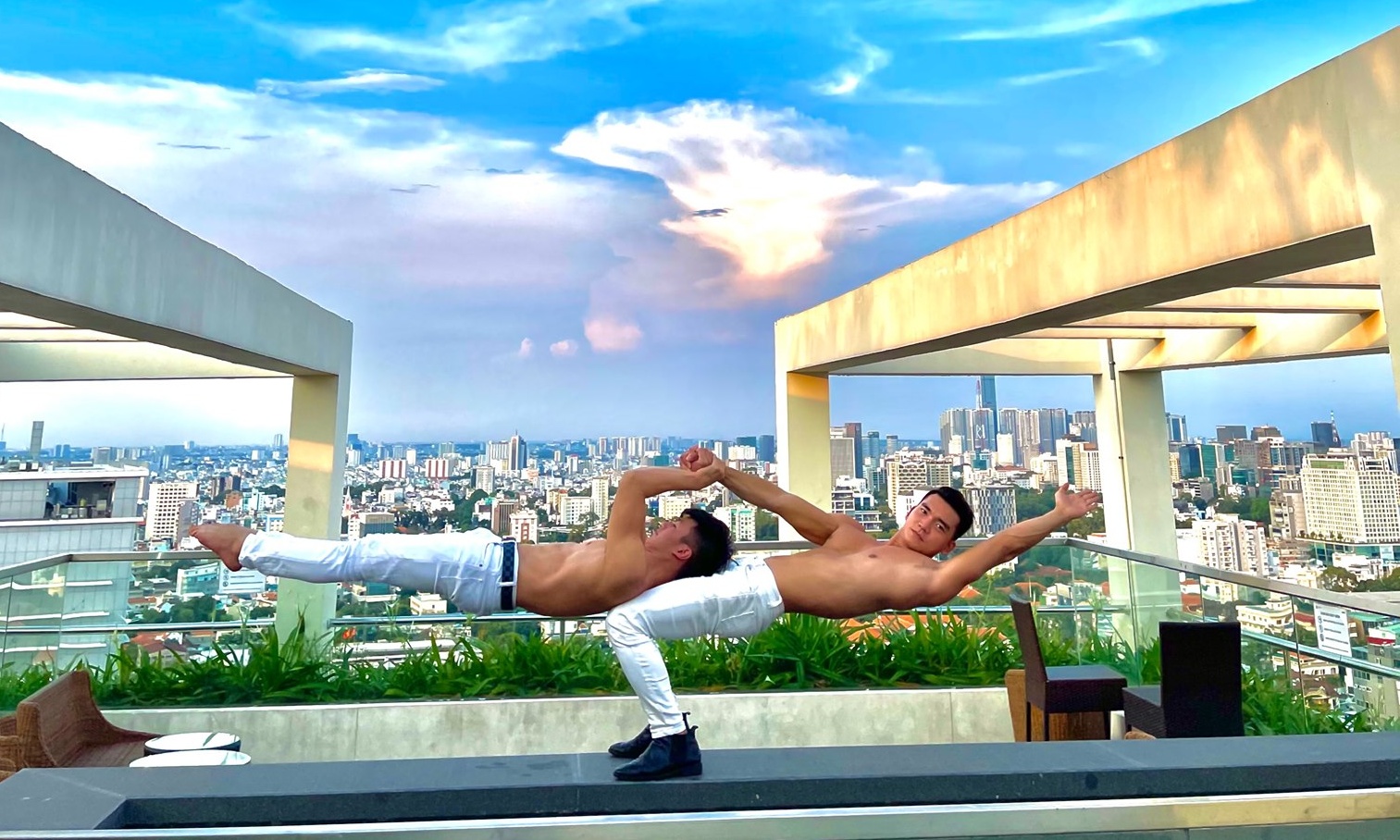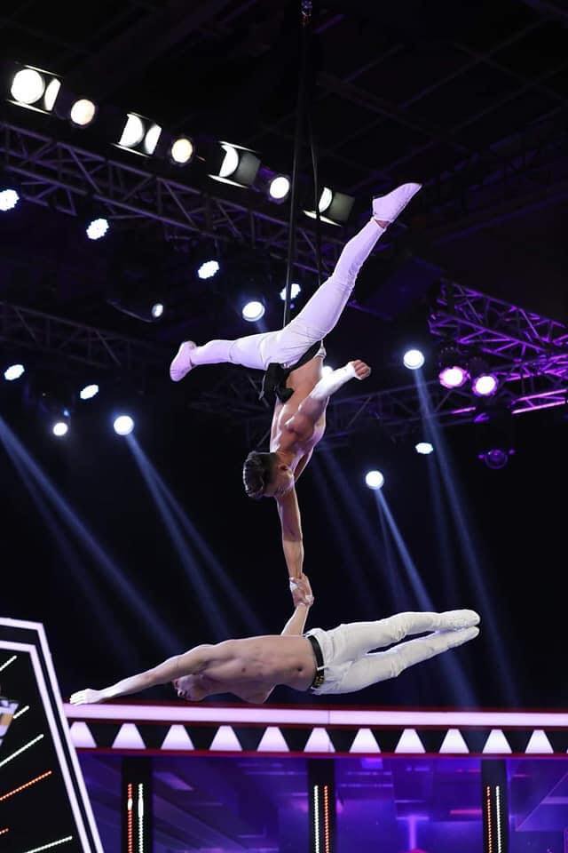 His specialty lies in aerial rope acts. Ngoc Hieu frequently performs in a duo with his colleague Trinh Thang (above), gaining experience from his senior. Consequently, when Hoa Minzy invited him to assist at her concert, he expressed confidence in performing the necessary movements.