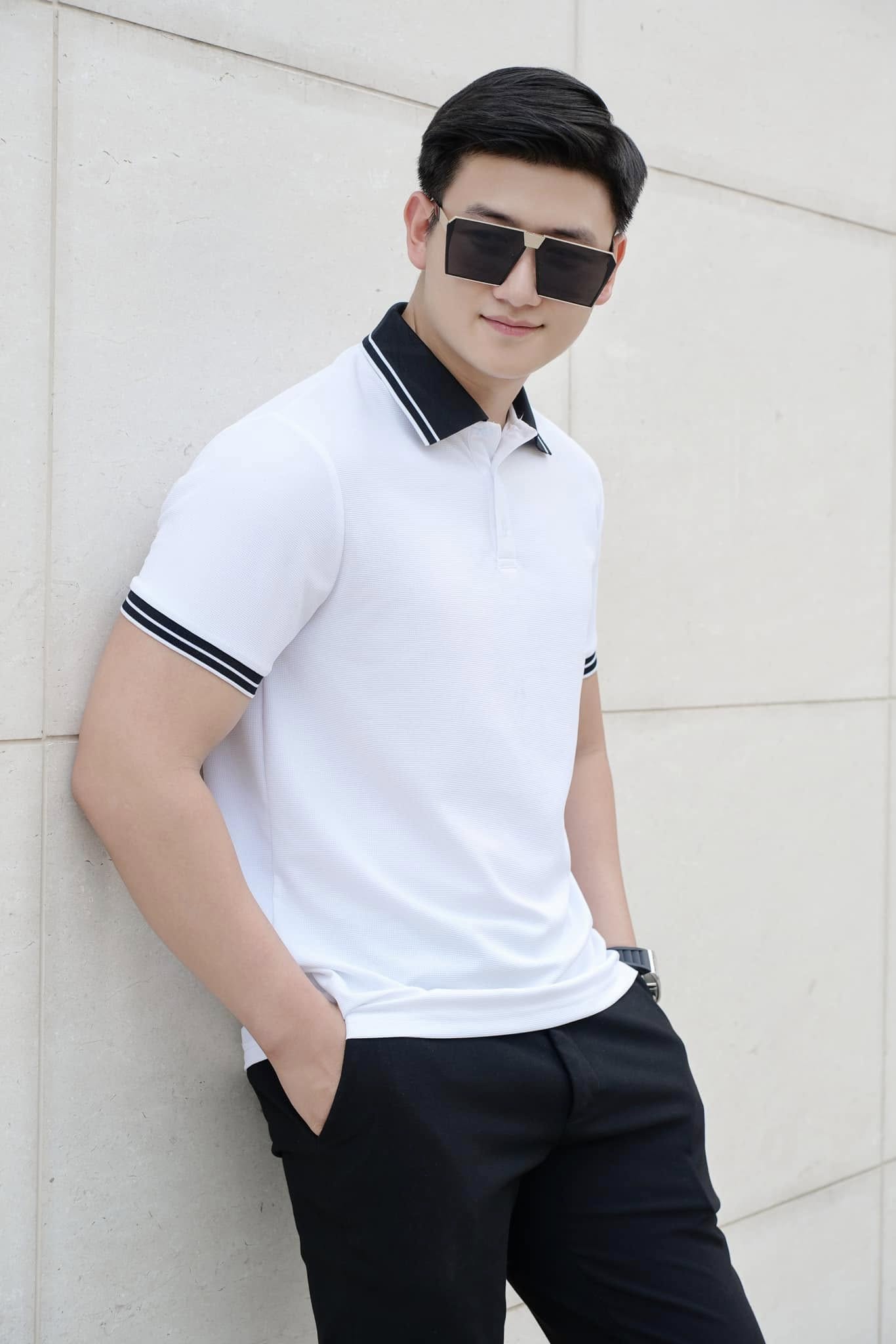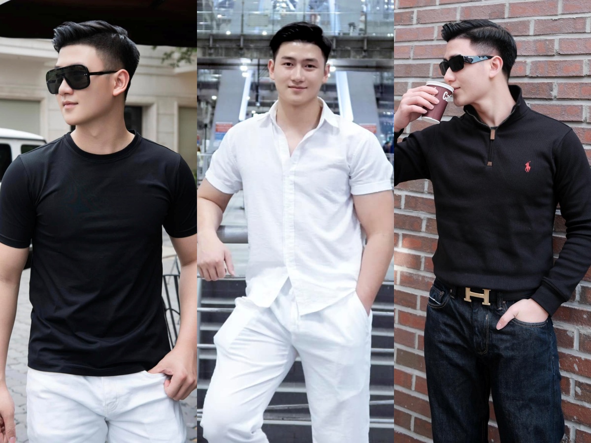 Ngoc Hieu favors monochromatic attire, primarily in white and black.