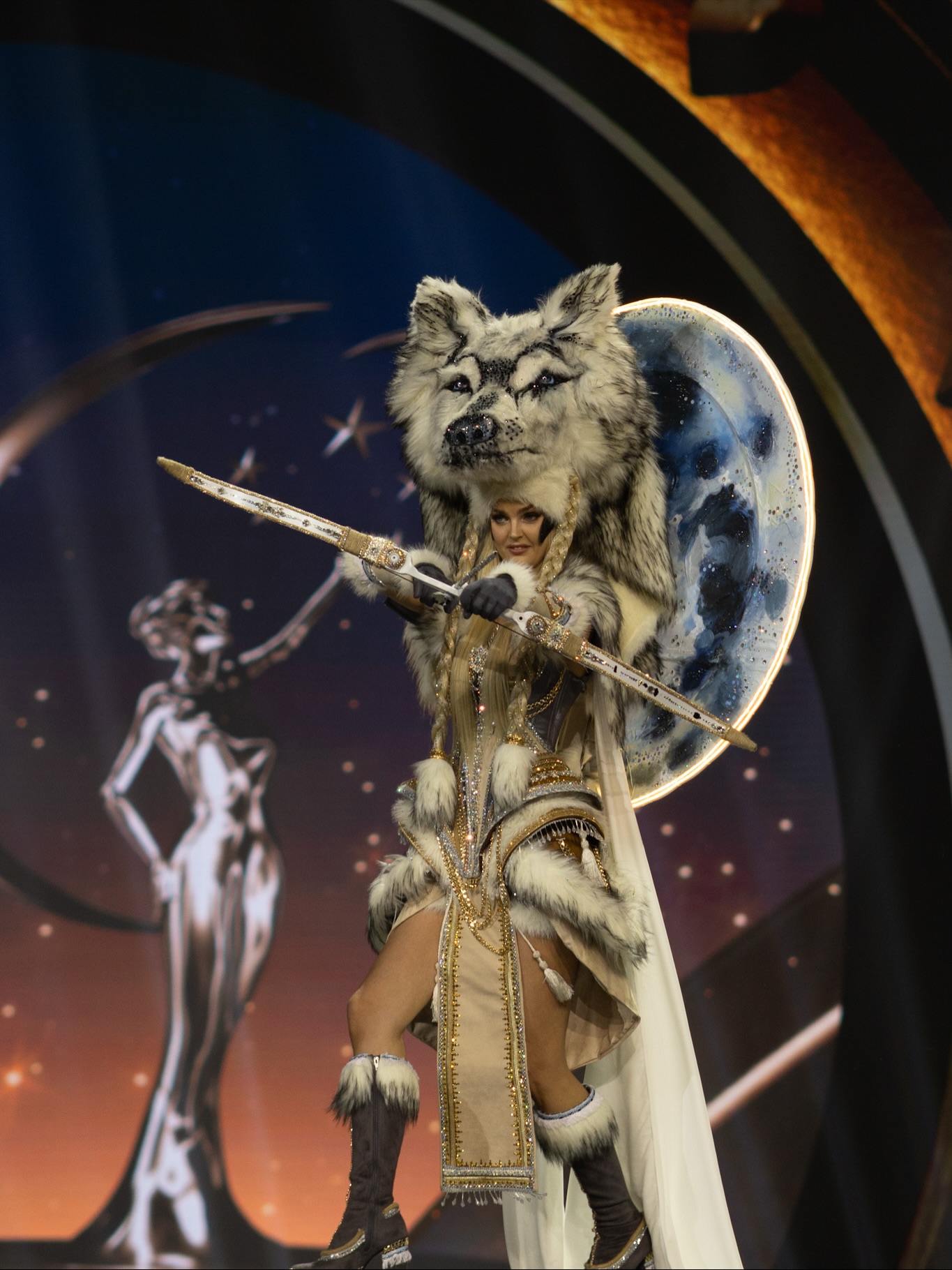 Brigitta Schaback, 28 years old, appeared in a costume inspired by the wolf and Norse culture. She wore a headpiece simulating a wolf's head, combined with a fur cloak and gold and silver embellishments. In her hand, she held a sword, with a round shield simulating the moon behind her.