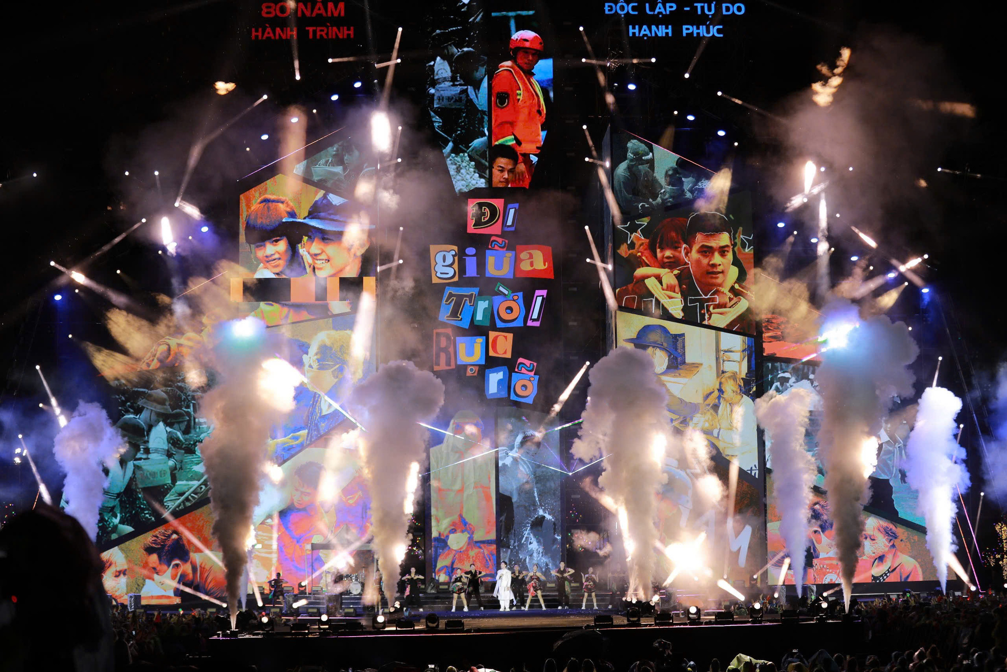 At 8:10 pm on 26/8, the show began at the Vietnam Exhibition Center (VEC) in Dong Anh amidst heavy rain and lightning. Despite the weather, the stands erupted when the music started with the opening performance of "Toi nguoi Viet Nam" by singers Duong Hoang Yen and Anh Tu. Duong Hoang Yen continuously energized the stage, asking, "The rain makes for a memorable experience, right everyone? Even the heaviest rain can't drown out everyone's energy, right?".