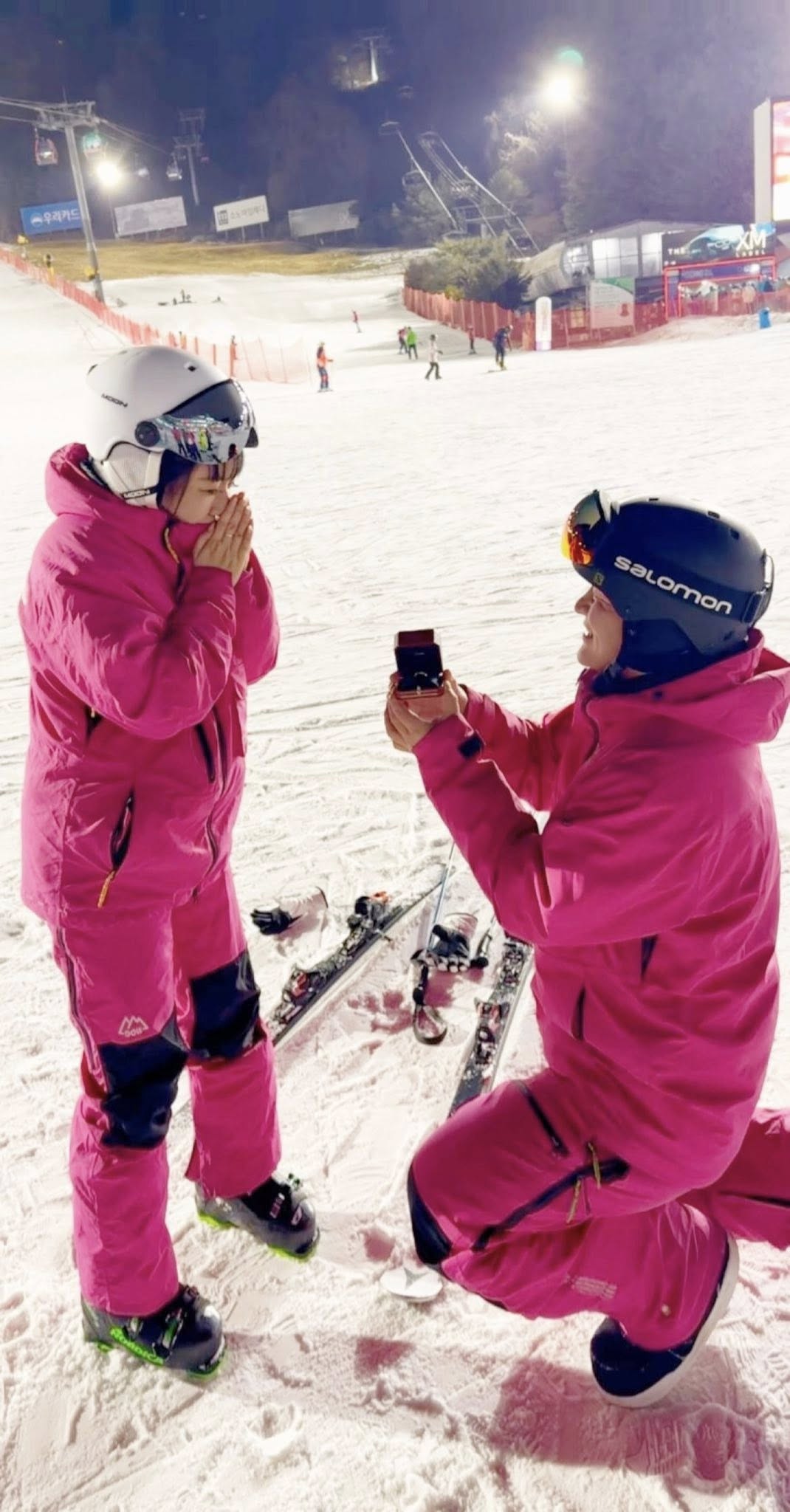 The Vietnamese designer and her boyfriend embarked on a business trip to South Korea in early February. On February 8, they joined close friends for a skiing excursion near Seoul. "I was surprised and happy when he knelt down and opened the engagement ring box on the ski slope because I had previously wished for such a moment," Anh Thu stated.