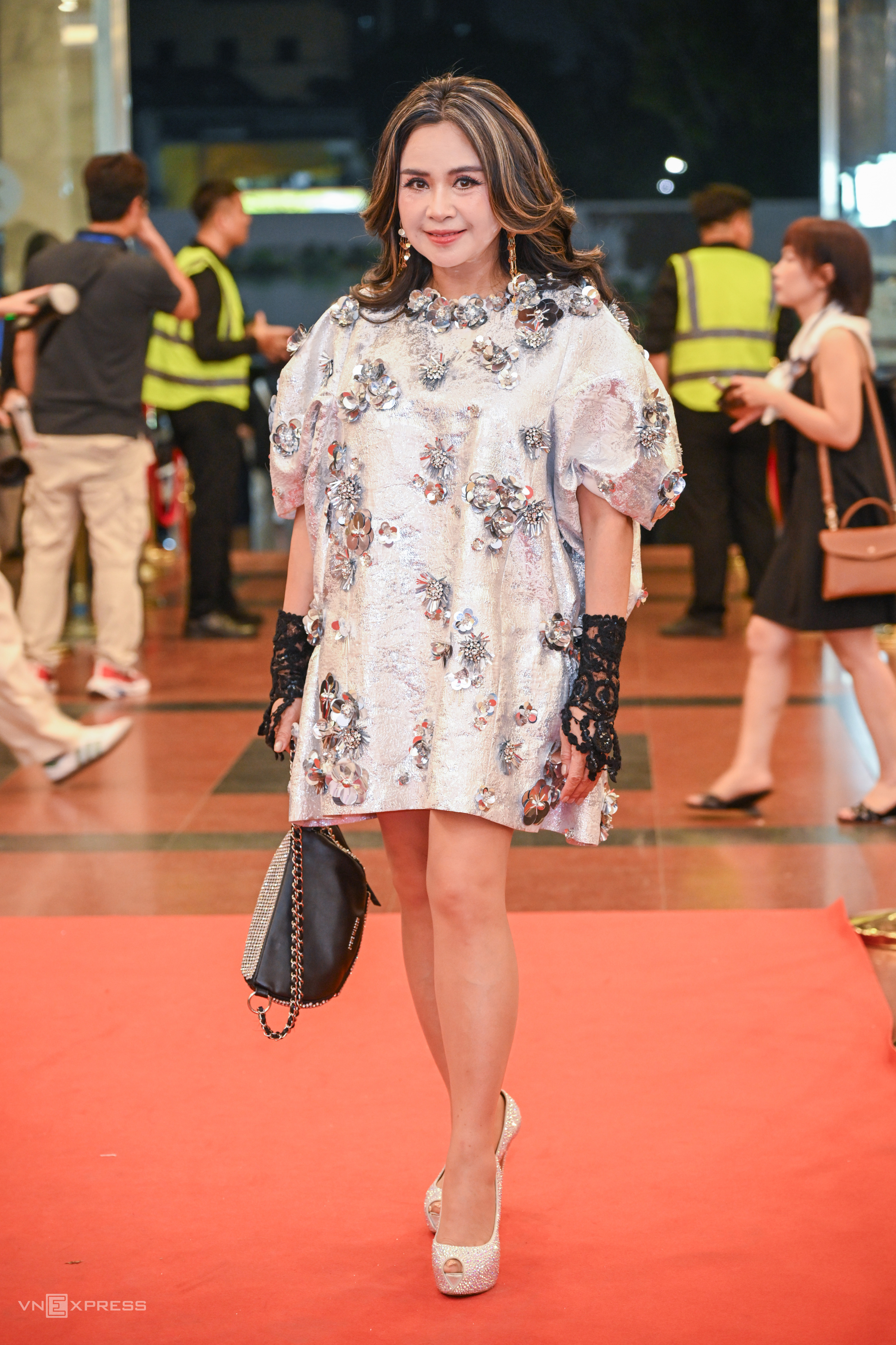 Diva Thanh Lam combined a 3D-patterned dress with fashionable gloves.