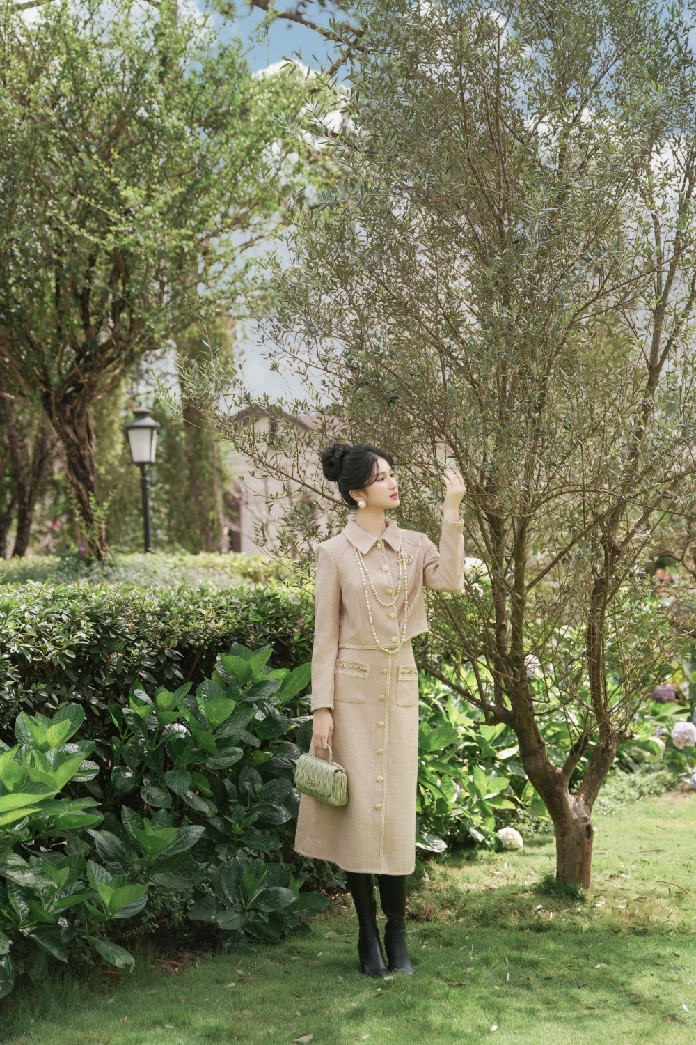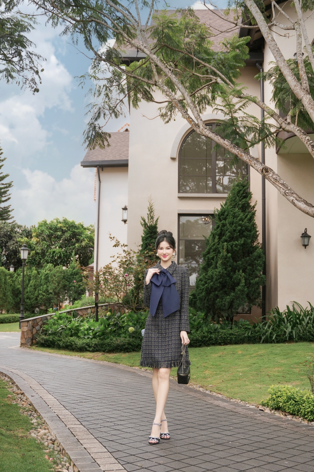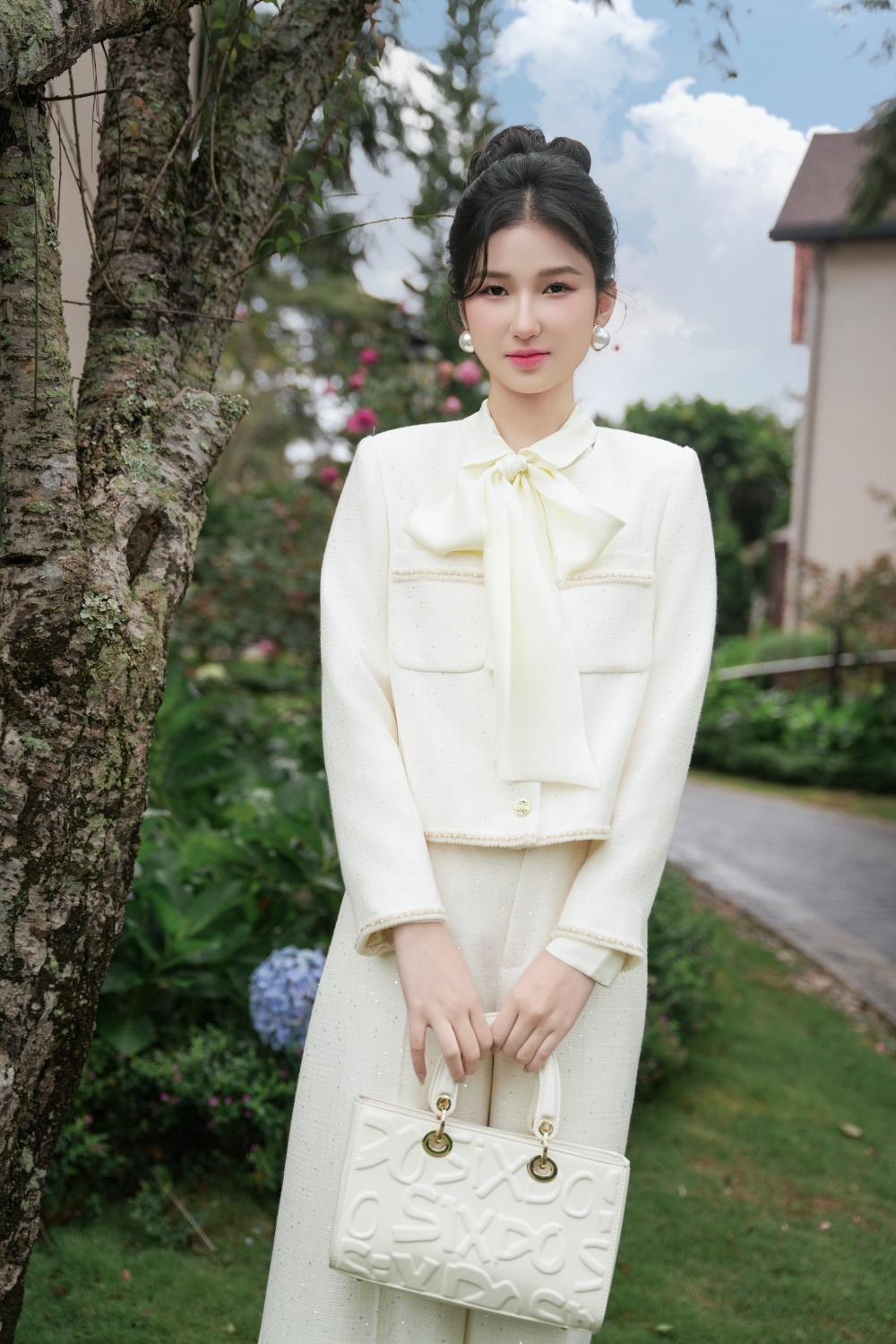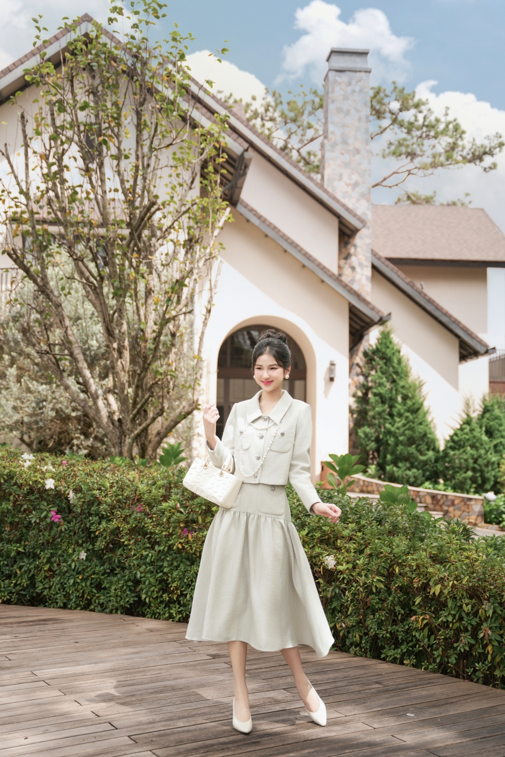 Inspired by elegant Parisian aesthetics, the collection features basic yet refined silhouettes. Key pieces include cropped jackets, midi dresses, A-line skirts, straight-leg pants, and minimalist shift dresses. For instance, Nang Mo was seen in a classic pink and green ensemble, pairing a short blazer with a pencil skirt.