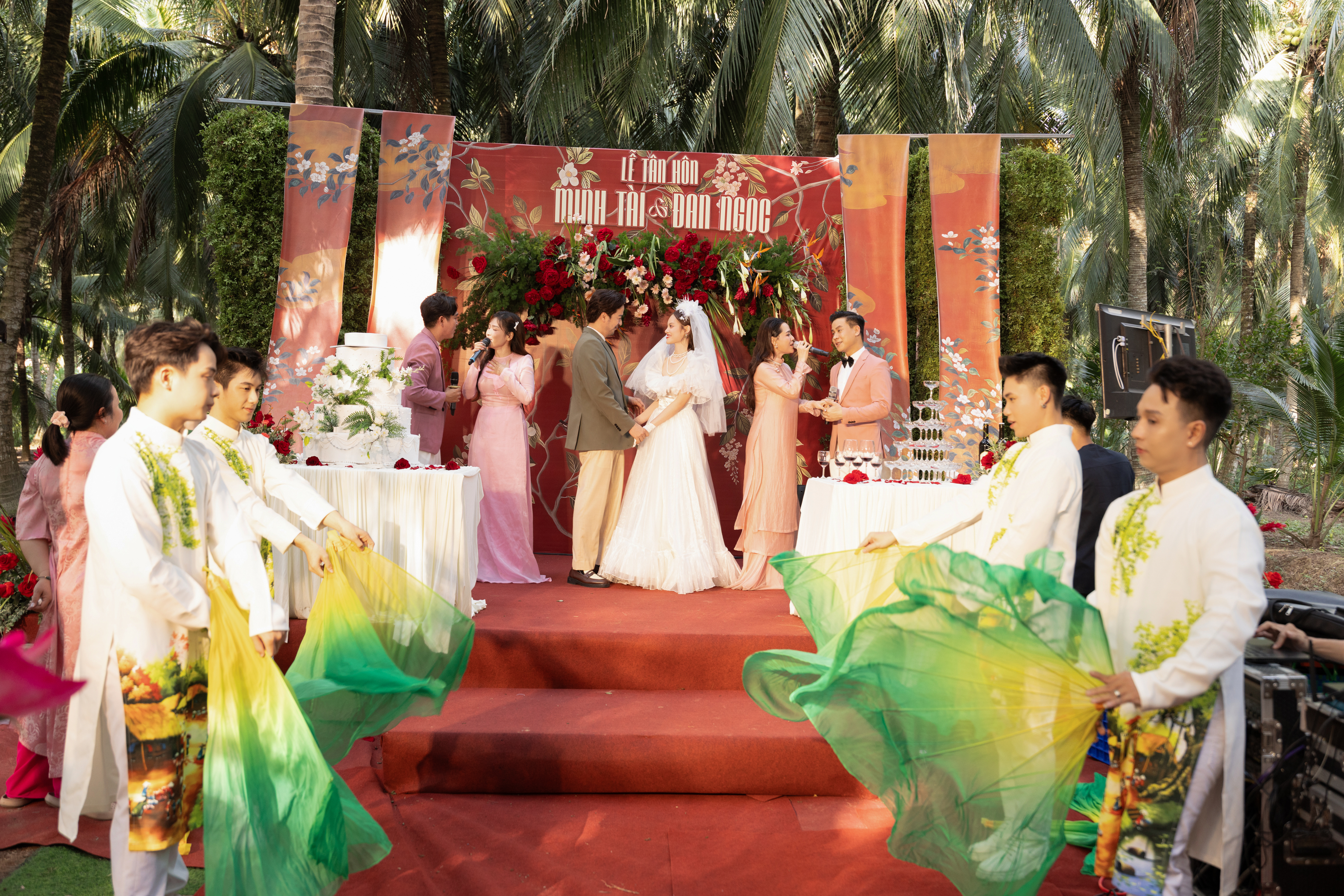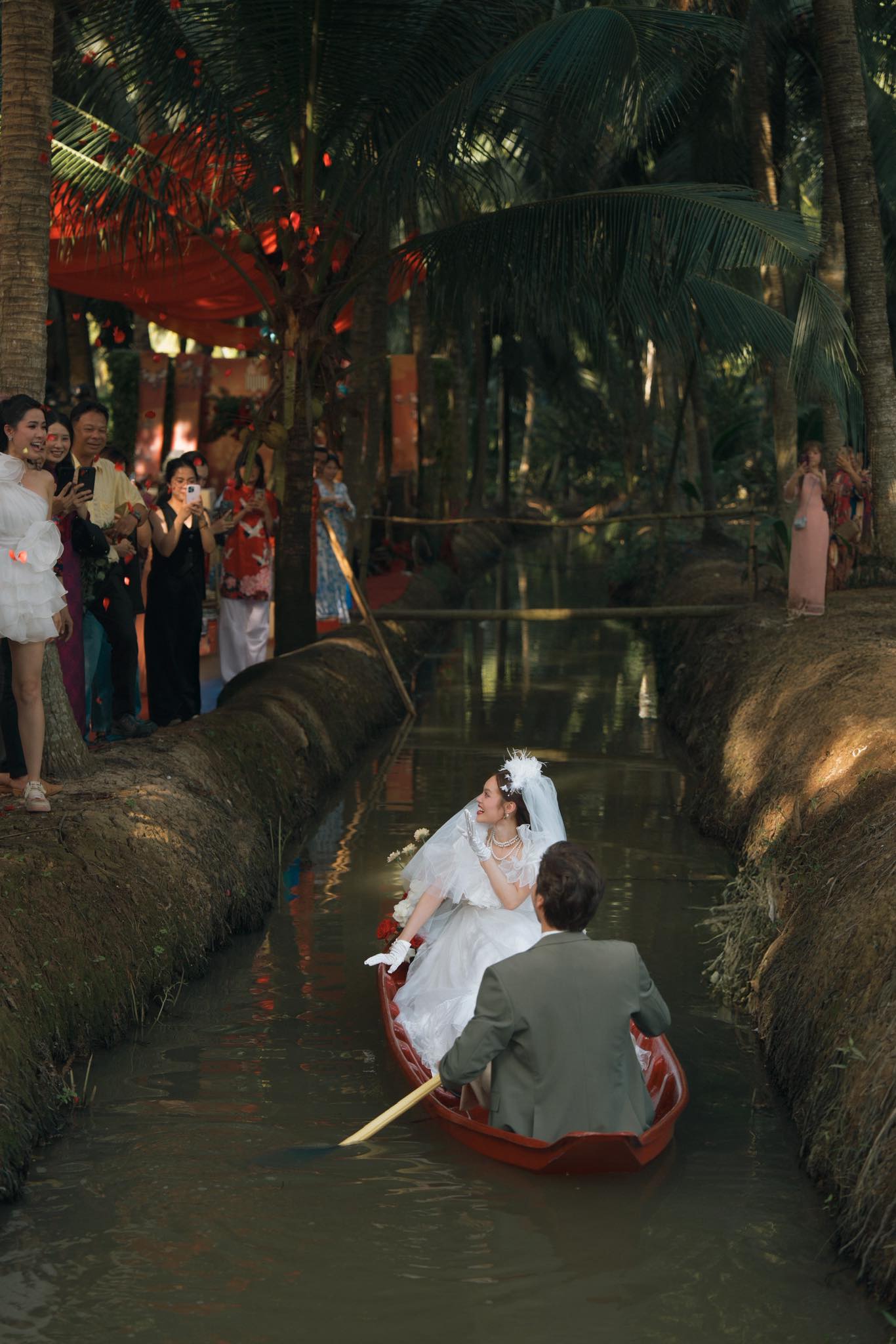 The couple's wedding ceremony embraced the distinct style of the Mekong Delta. The groom's family incorporated characteristic elements of river life into the celebration, from the wedding feast featuring local dishes to the bridal procession by boat on the canal in front of their home.
