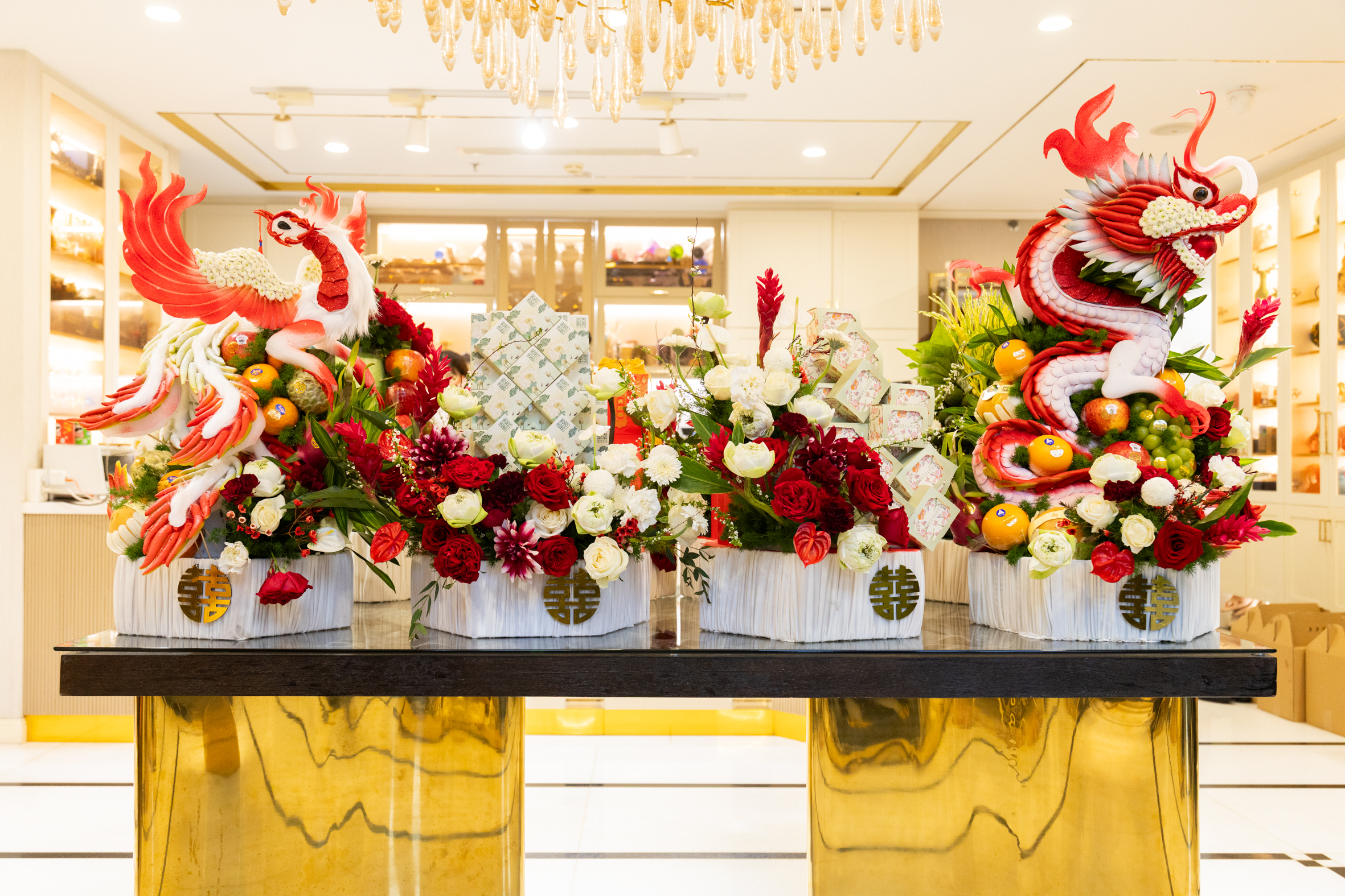 The betrothal gift trays were arranged with dragon and phoenix motifs using fruits and betel leaves, symbolizing prosperity, happiness, and wealth. |