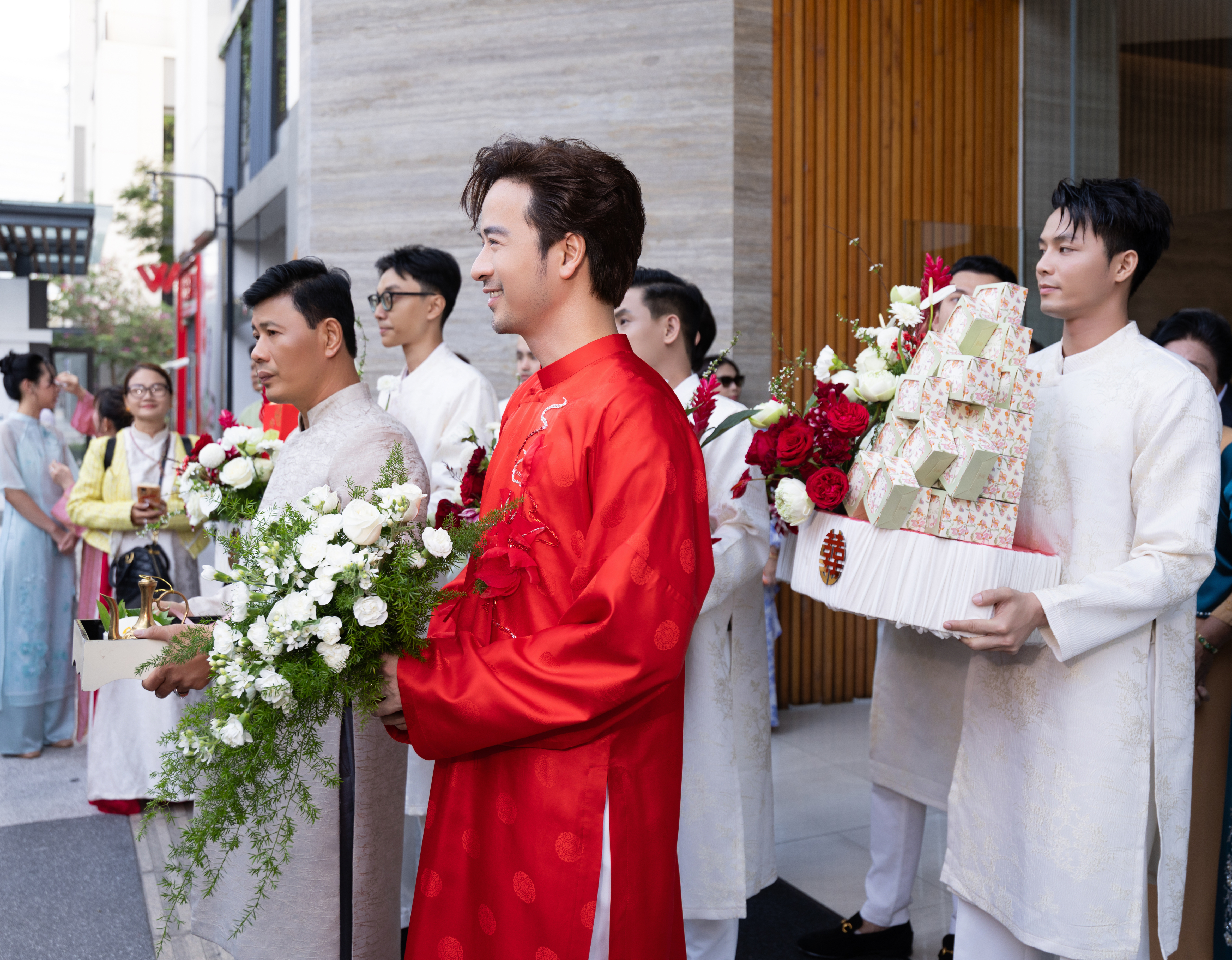 Earlier that morning, the groom, dressed in a traditional ao dai, led a procession carrying eight trays of betrothal gifts to the bride's home in TP HCM. The gifts, arranged with dragon and phoenix motifs using fruits and betel leaves, symbolized prosperity, happiness, and wealth. The group then traveled over two hours by oto to the groom's family home in Vinh Long for the main ceremony. The bride wore a 1990s-style wedding dress with puff sleeves and a flower-adorned veil, while the groom opted for a neutral-toned suit with a classic, slightly vintage silhouette.