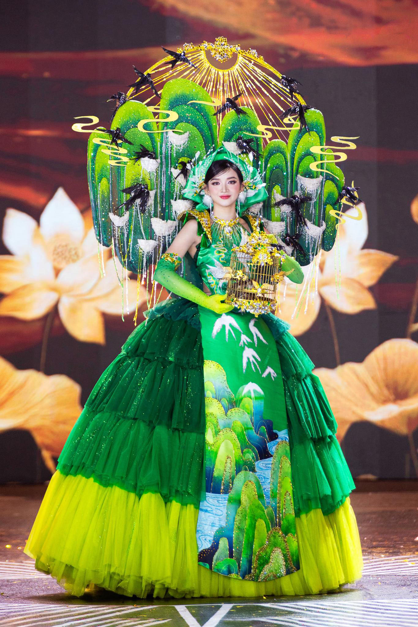 Dinh Y Quyen performed "Swallow Dance" by young composer Nguyen Ngoc Quynh Mai, inspired by the swallow farming village of Vinh Hoa, Khanh Hoa, during the National Costume competition. |
