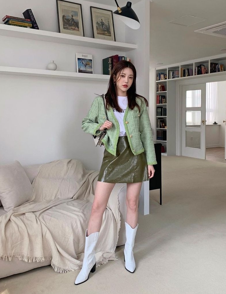 Many options exist when combining boots with short outfits, such as a mini skirt with cowboy boots and a tweed jacket. |