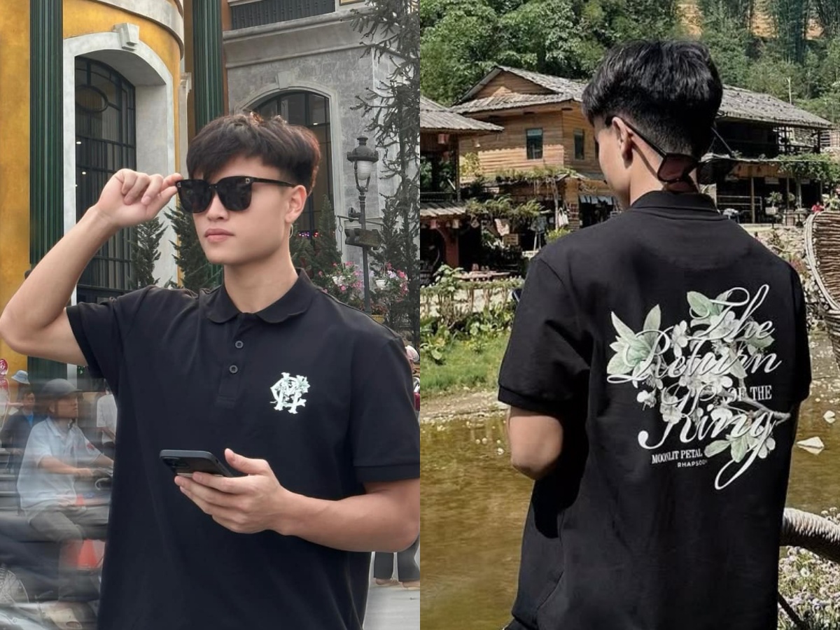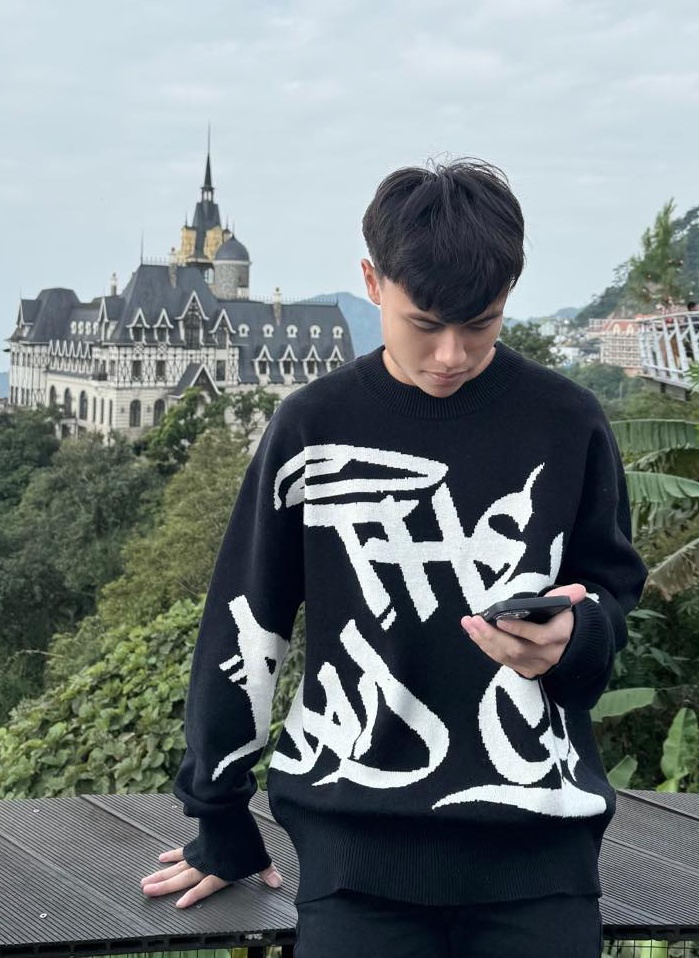 Printed or embroidered patterned outfits are a familiar choice for Minh Phuc. He combined a long-sleeved knit shirt with distressed jeans for a rugged style during a trip in 2023. |