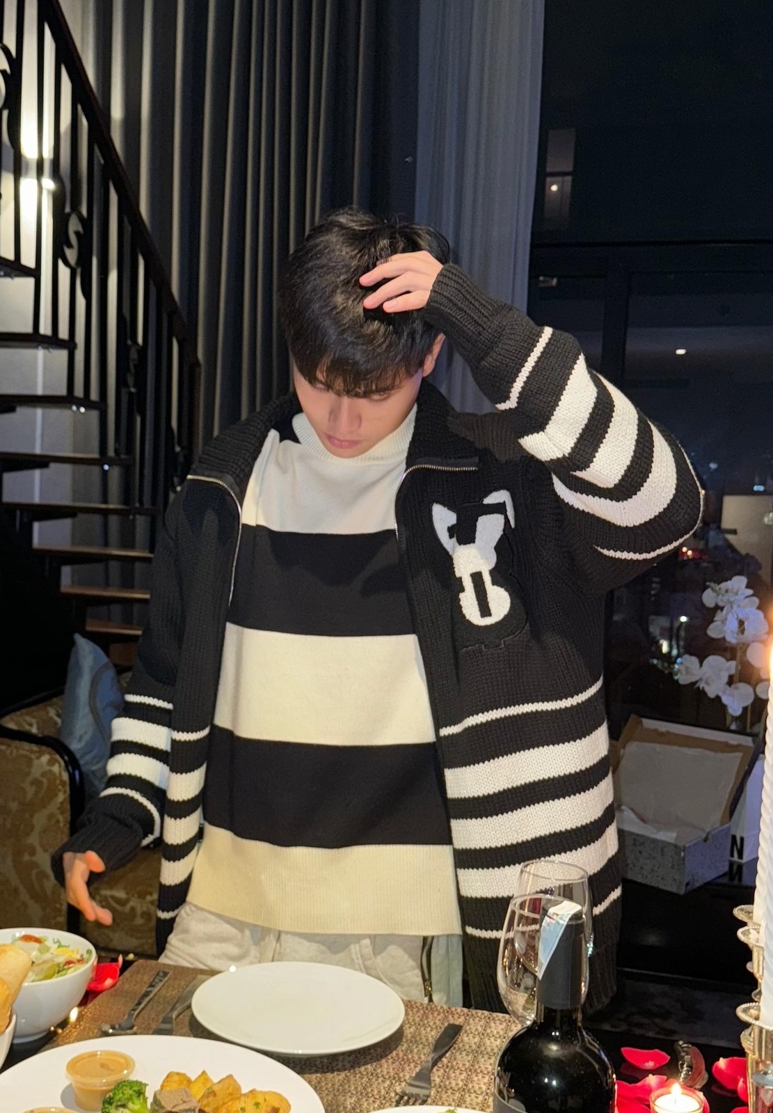 Minh Phuc favors monochromatic outfits, mainly white or black. He coordinated layered outfits, including a sweatshirt and wool jacket, when attending a party. |