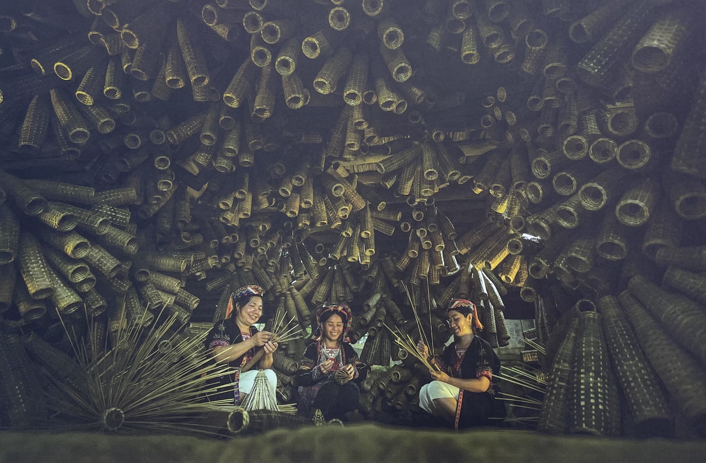 Under the theme "Diverse and Unique Vietnamese Cultural Heritage," the organizers present a photograph depicting the bamboo trap weaving craft of the Thai people in Nghe An.