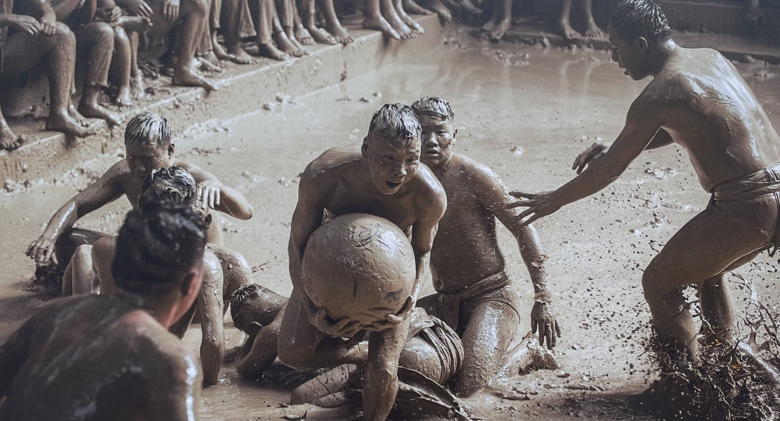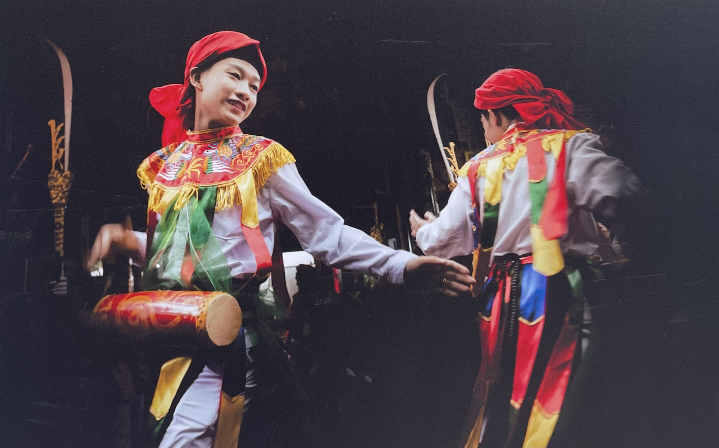 The "Con Di Danh Bong" folk game from the Trieu Khuc village festival, Tan Trieu commune (now Thanh Liet ward), Hanoi. In this game, village men dress as women, wearing traditional four-panel dresses and crow-beak scarves, with "trong bong" drums tied to their chests, dancing and drumming to the rhythm of the festival drums. |