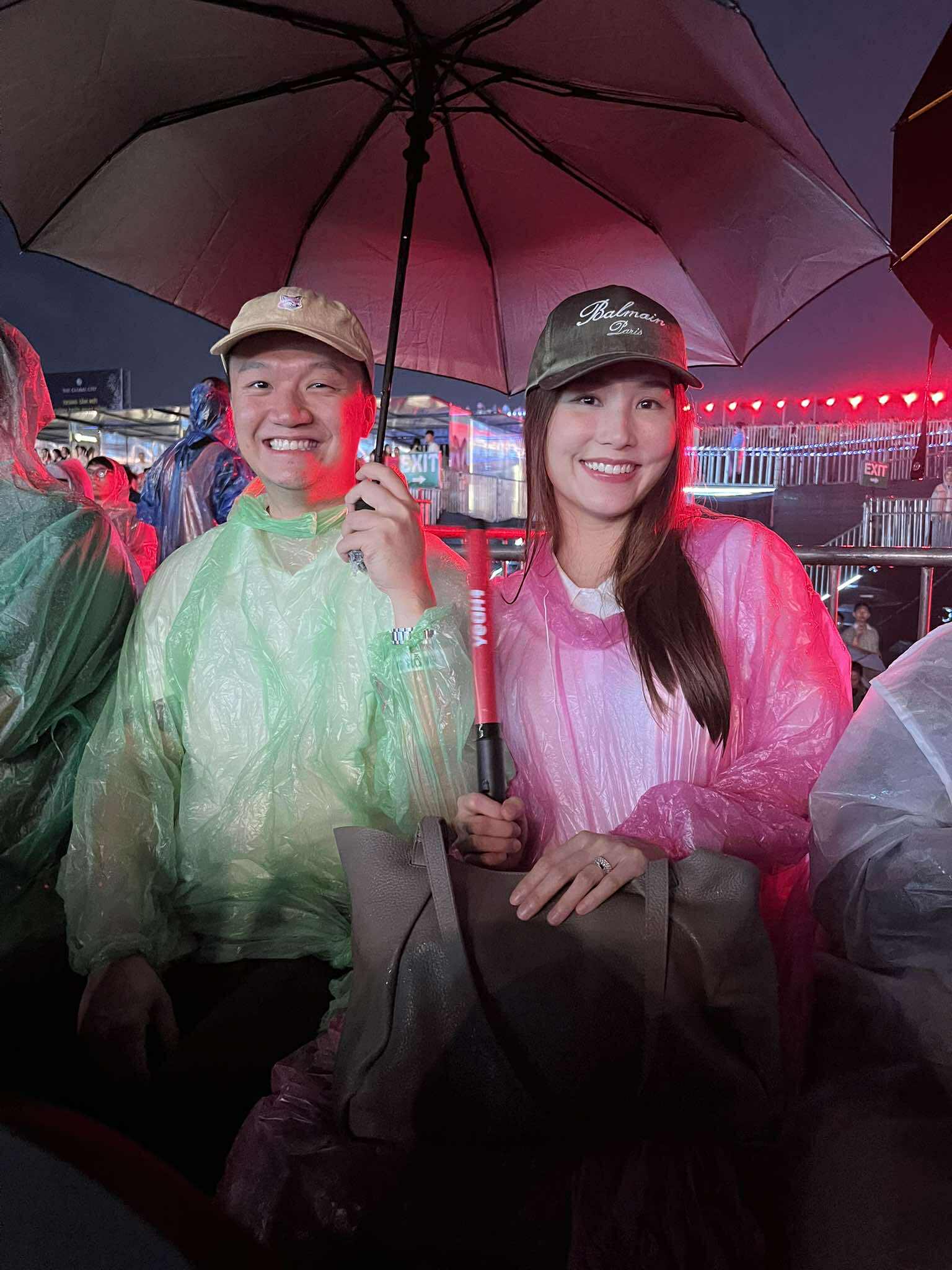 Actress Diem My 9x and her husband wear raincoats while waiting for the concert to begin. Photo: Hoang Dung