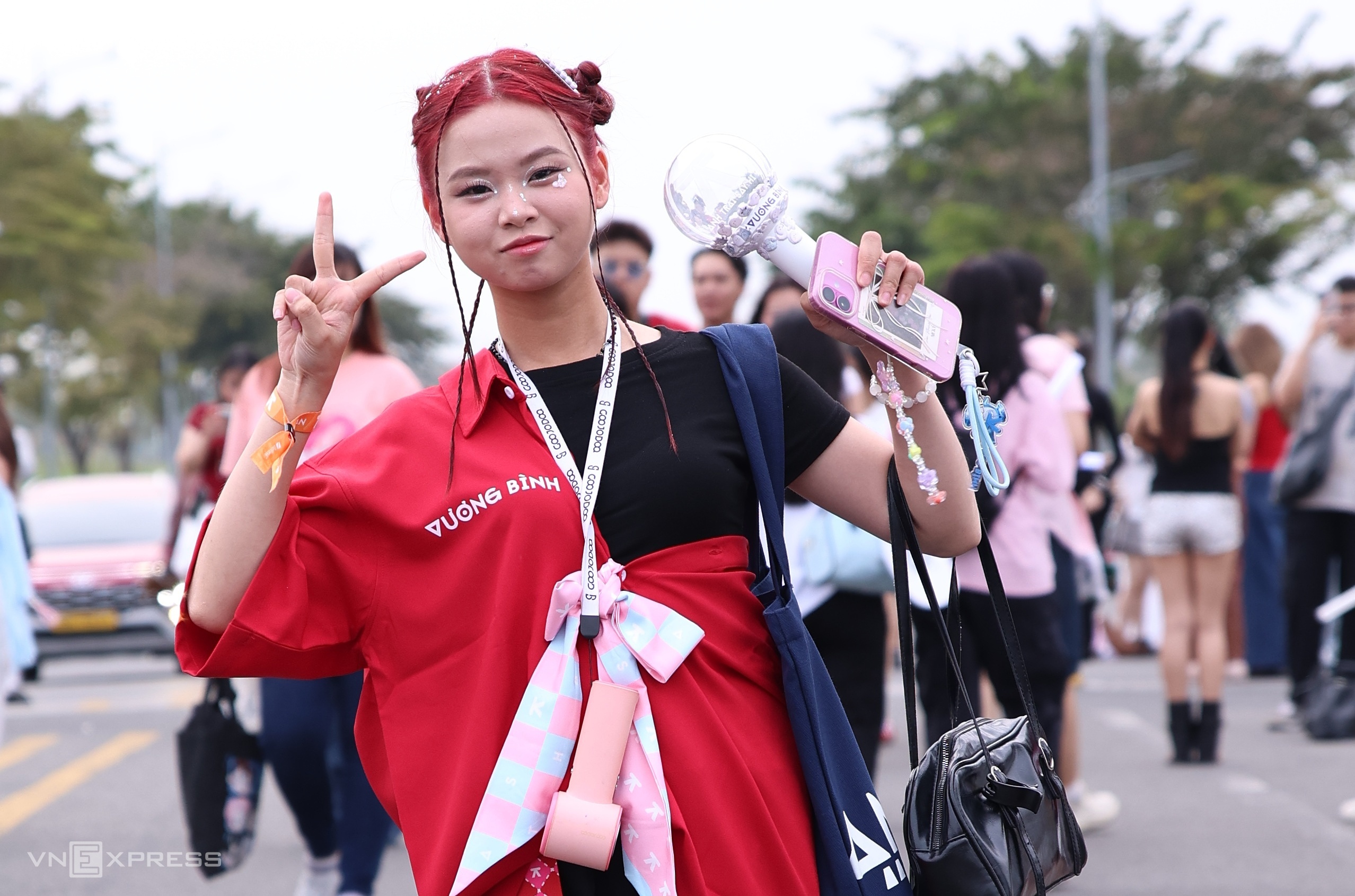 A fan of Vuong Binh dyed her hair and wore many accessories. The "bling bling" makeup trend has been popular among young people for about two years, favored by many young girls for its ability to create a distinctive look. |
