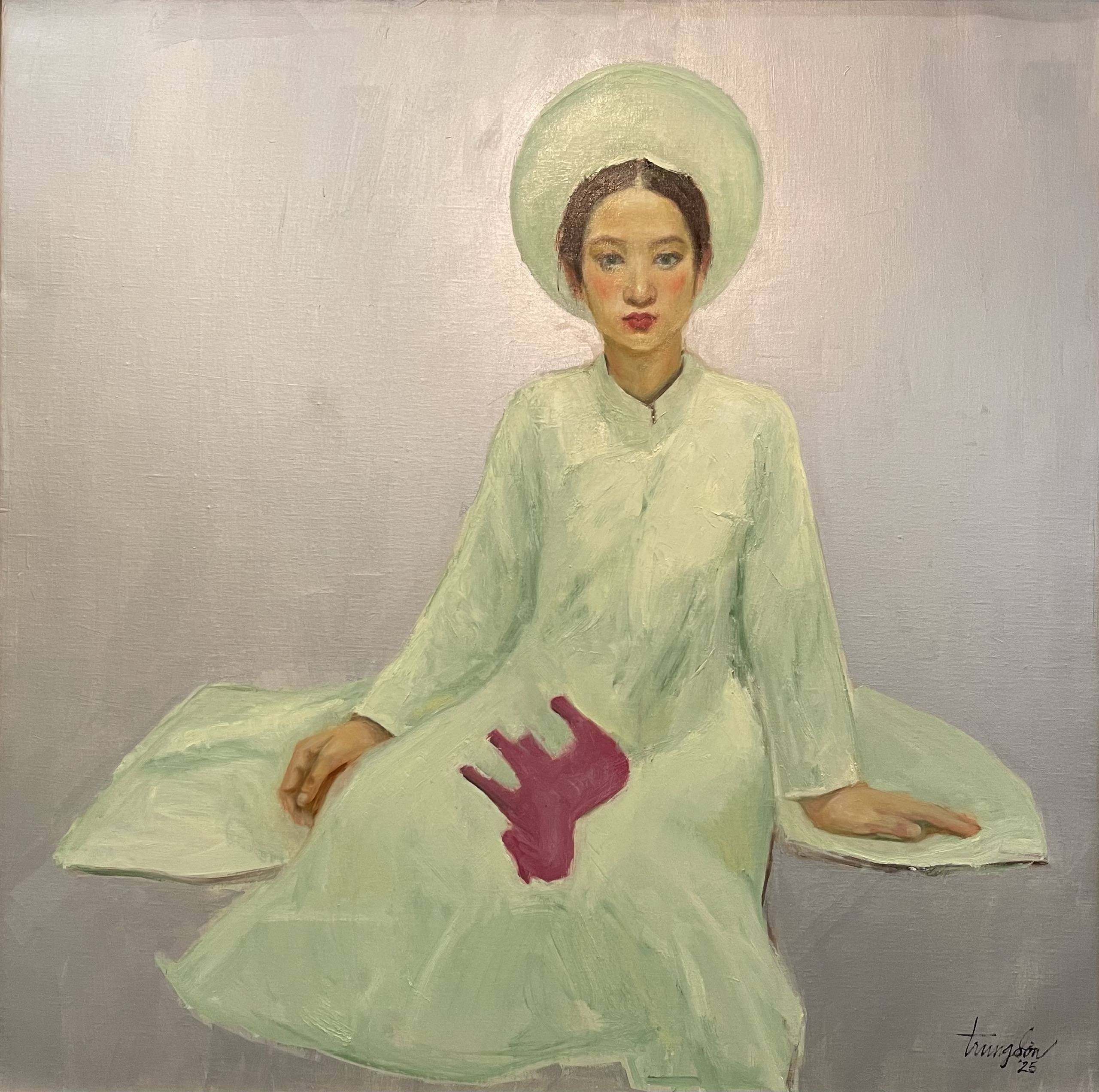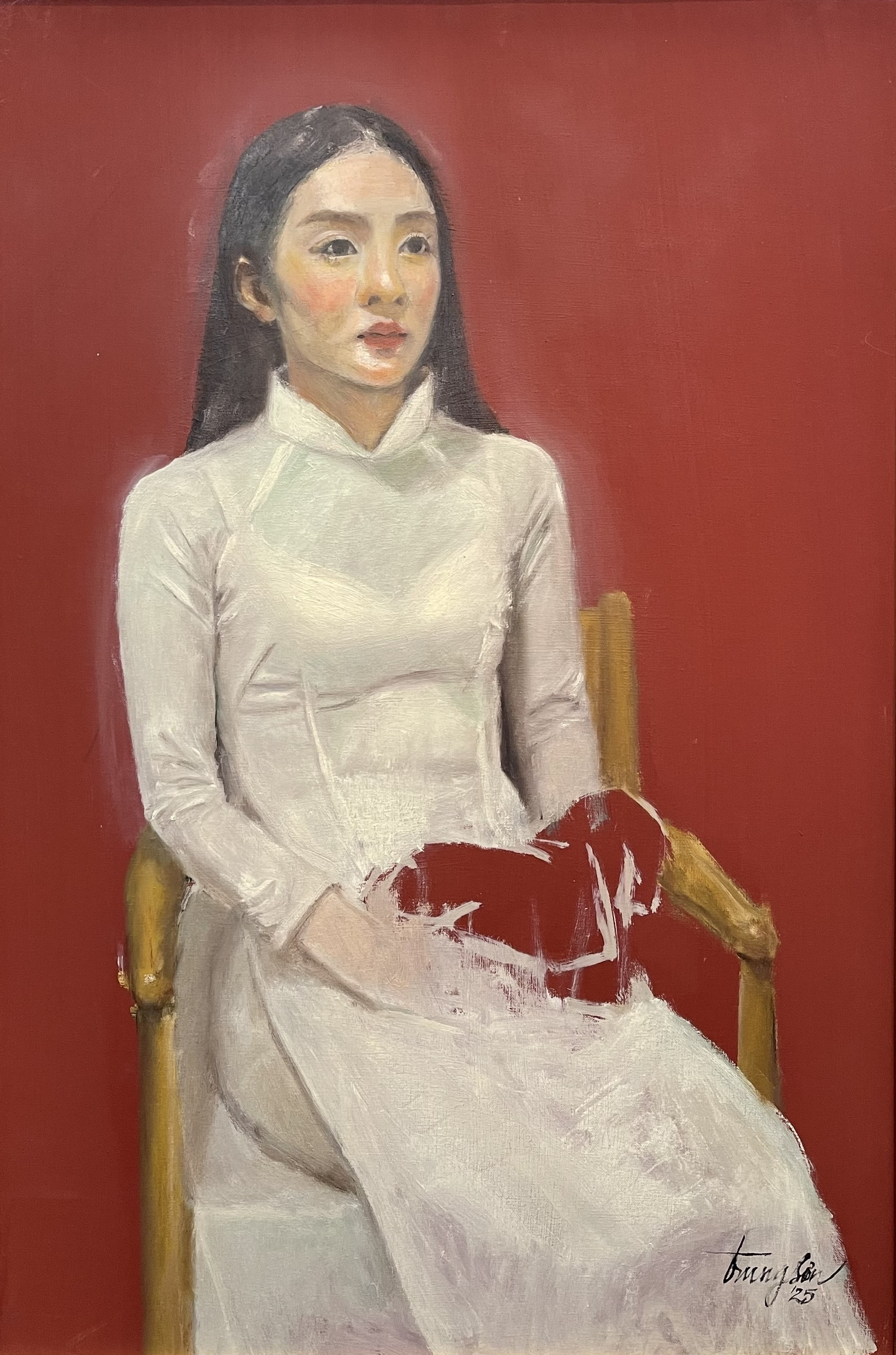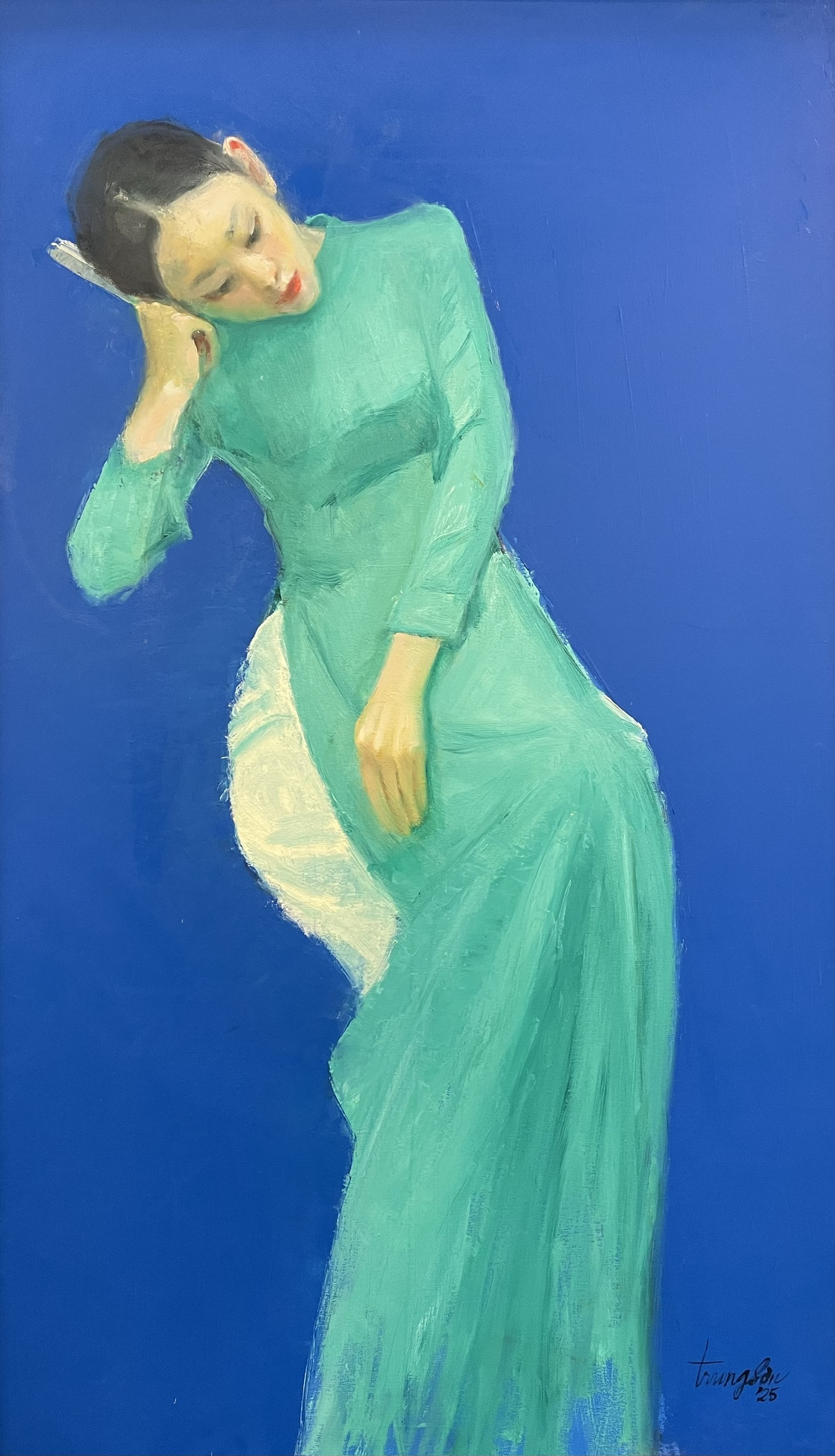 In his portraits, such as "Tuoi mo 1" (Dream Age 1), Trung Son depicts girls in traditional white ao dai, using vibrant monochromatic backgrounds to highlight the subject. He does not focus on precisely depicting the model's facial features but rather relies on his own feelings, retaining only the most characteristic details. In some works, the painter initially drew chairs for the girls, then gradually removed them, portraying figures in a sitting posture but without support. This compositional choice creates a space for the audience to "step into" and form their own interpretations.